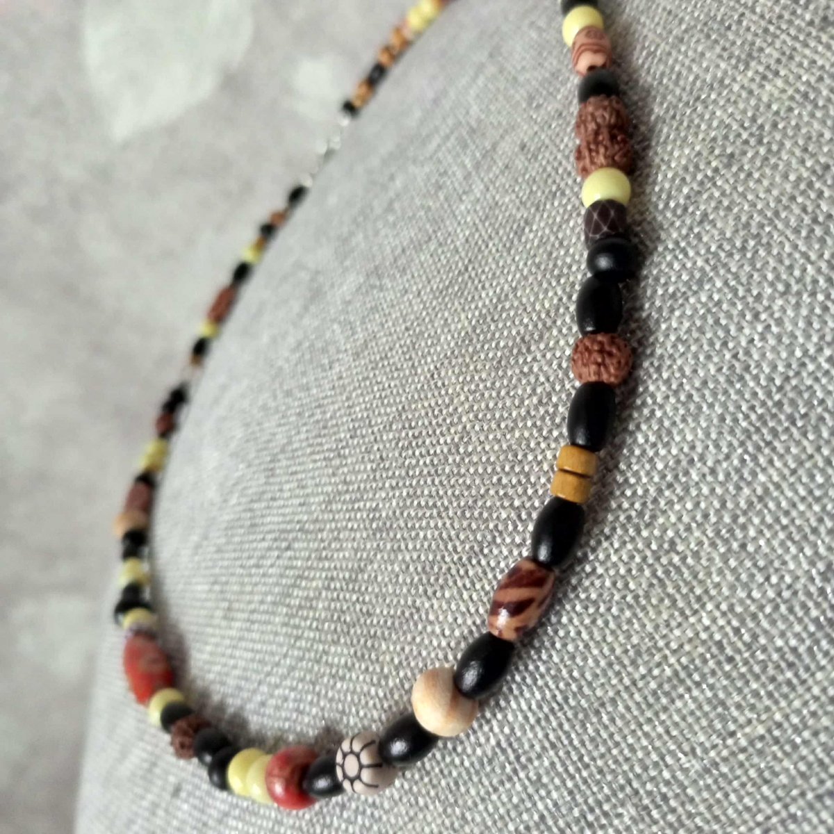 Náhrdelník v etno stylu ze dřevěných a skleněných korálků a semínek rudrakshi. Nejmenší korálky mají 3mm a největší délku 15mm.