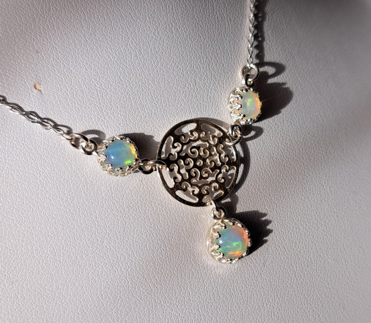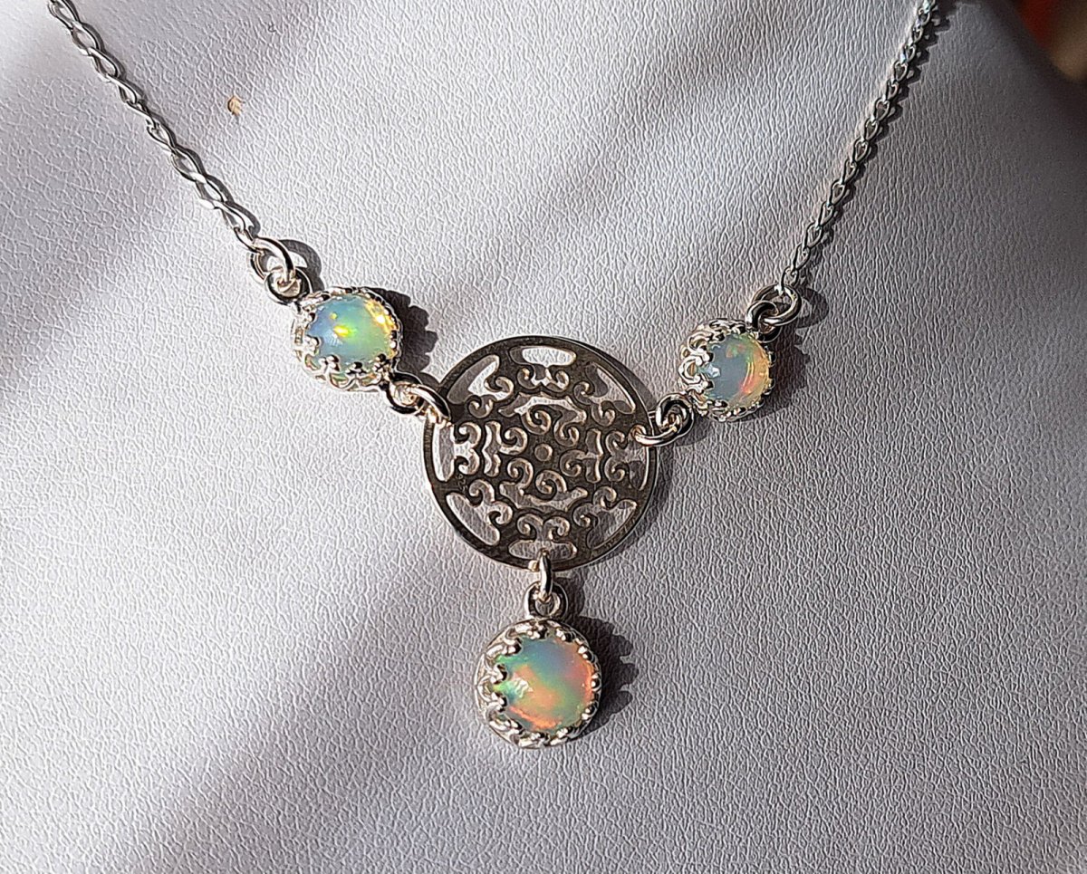 45 cm dlouhý náhrdelník etiopského opálu na stříbrném řetízku a mandalou. Ag 925/1000. Průměr opálku 6 mm a 7 mm. Mandala průměr 16 mm