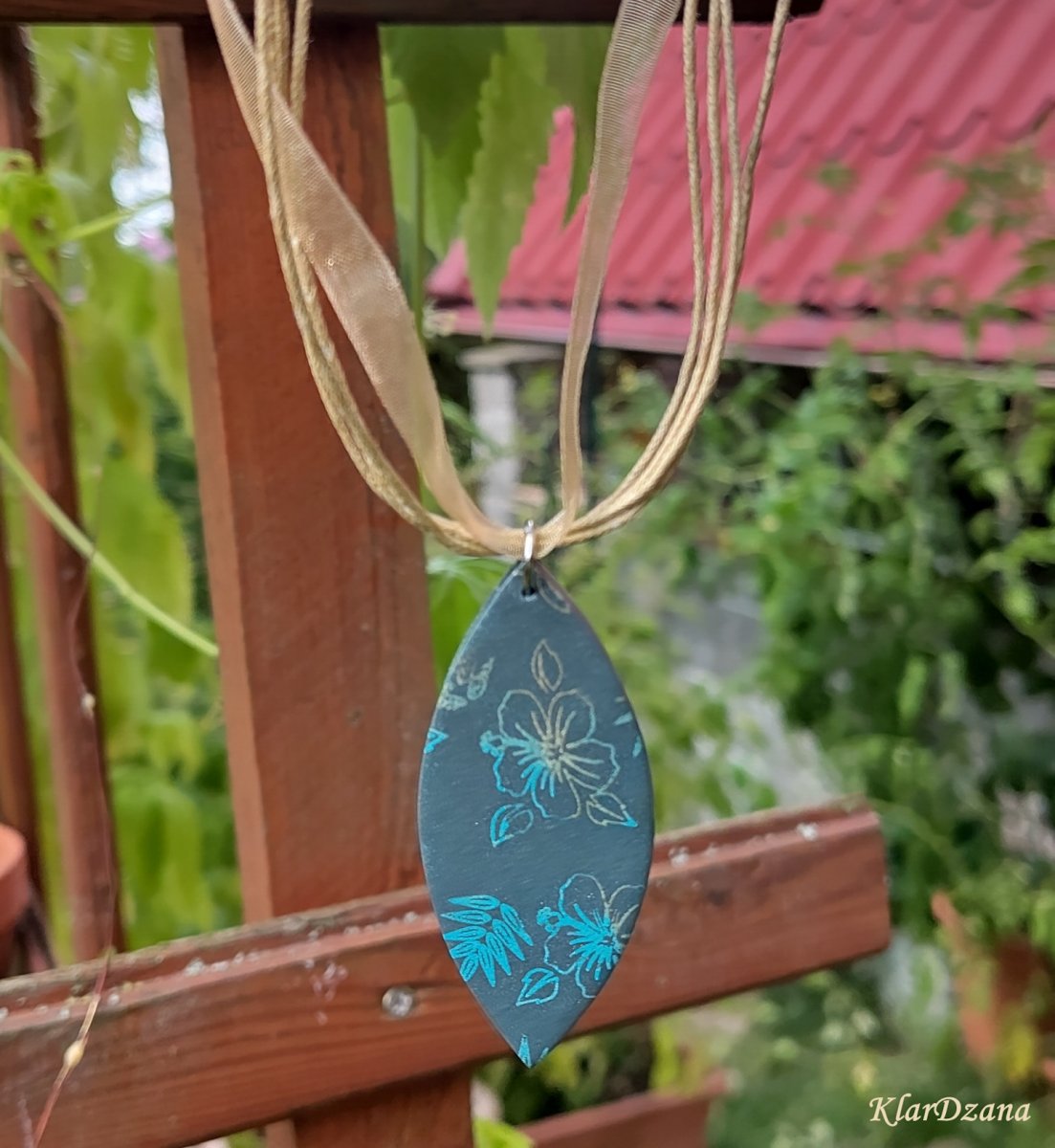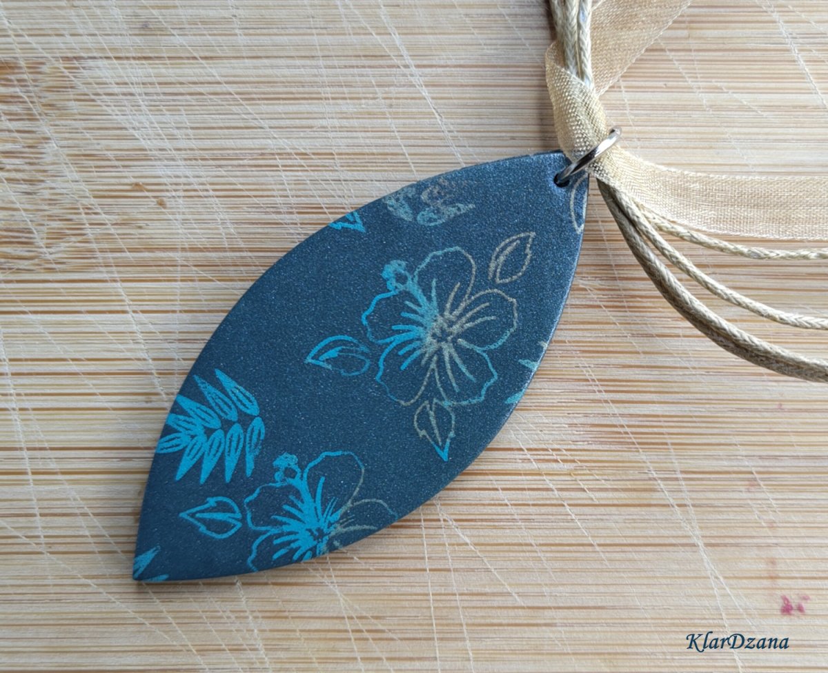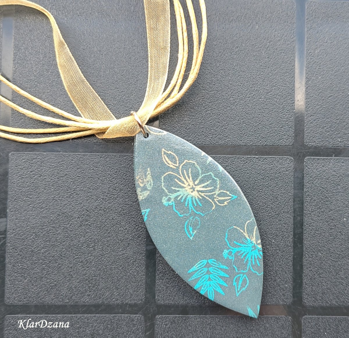 Přívěsek na zlatavě okrové stužce se šňůrkami z polymerových hmot zdobených sítotiskem, v jemných barevných tónech