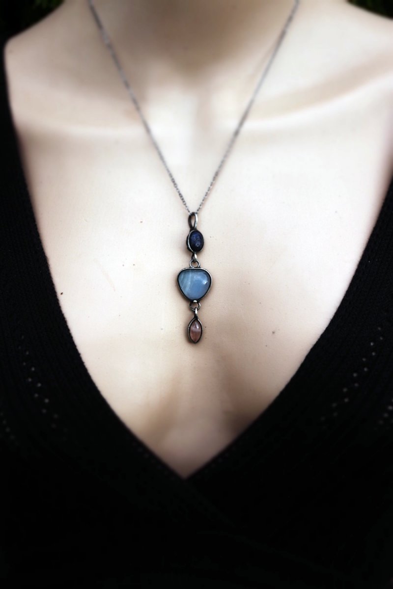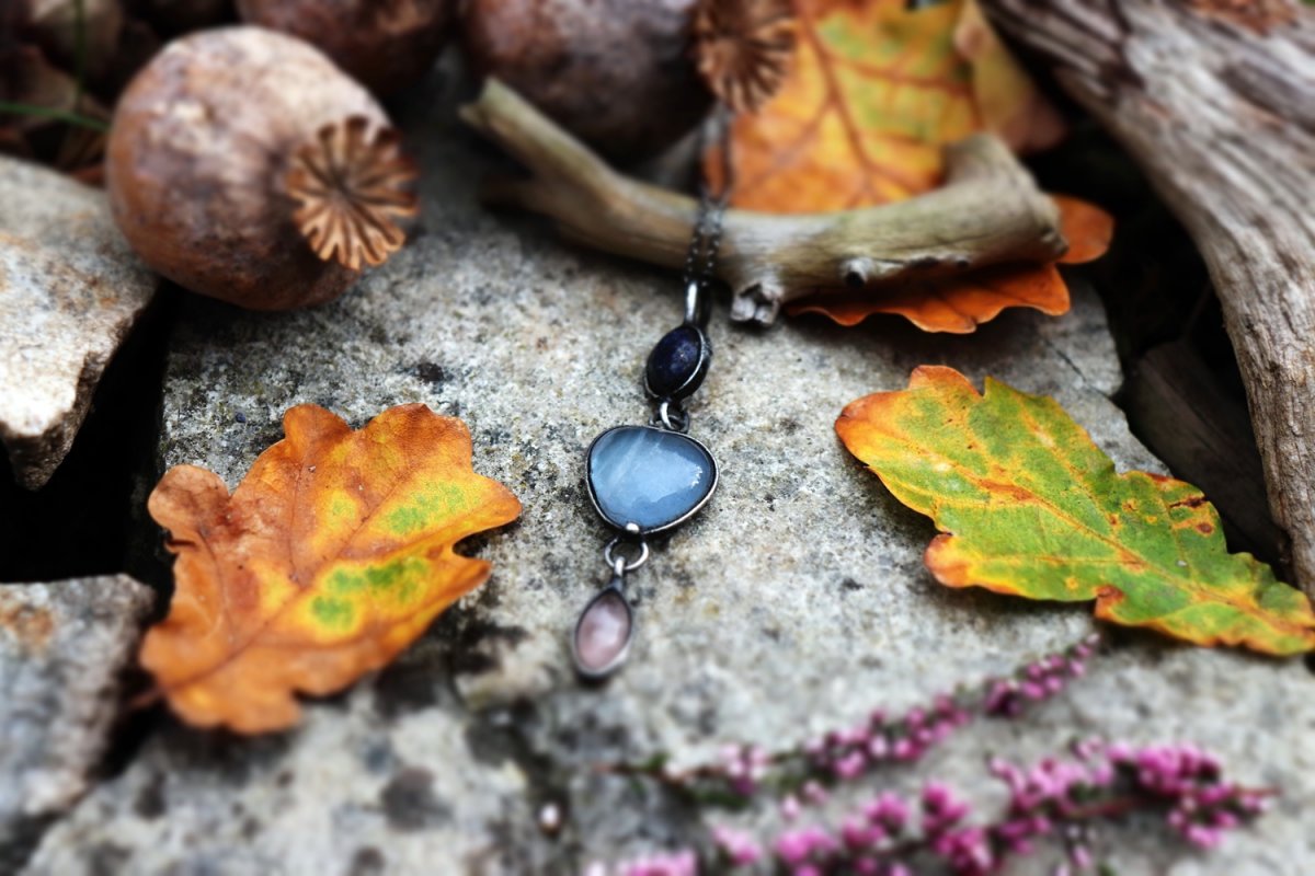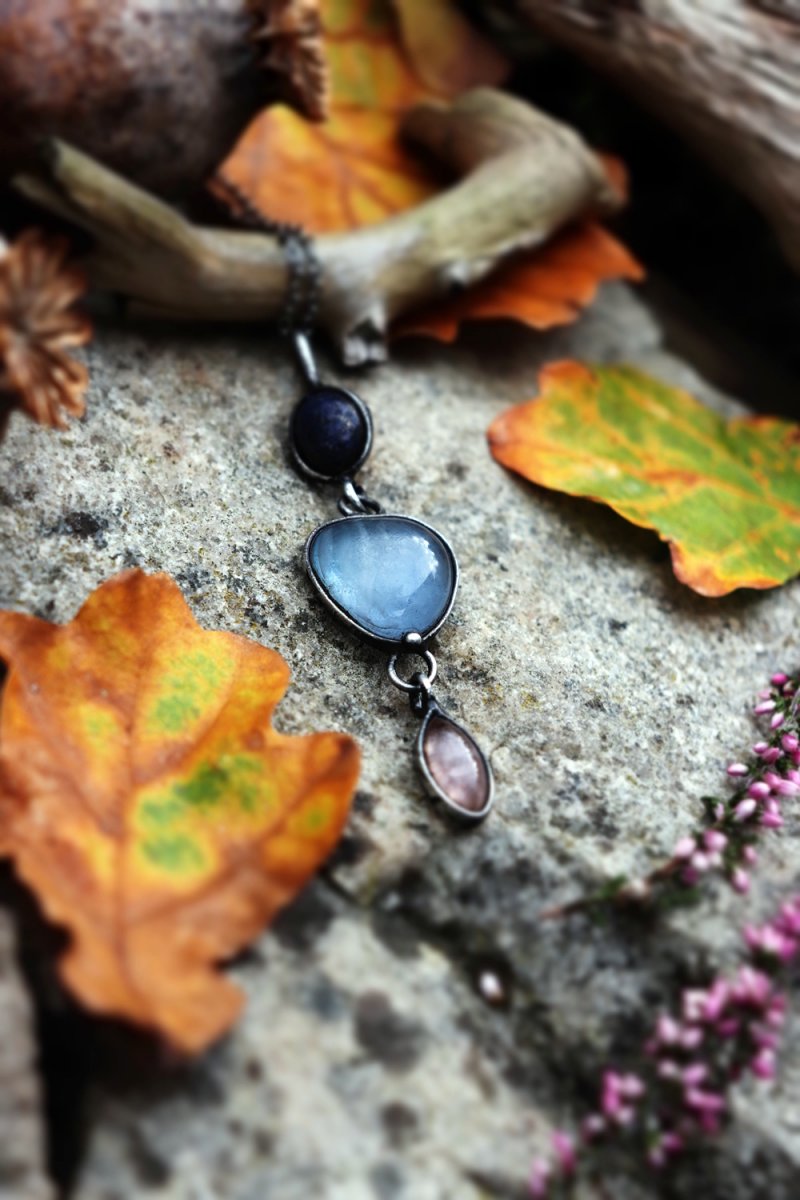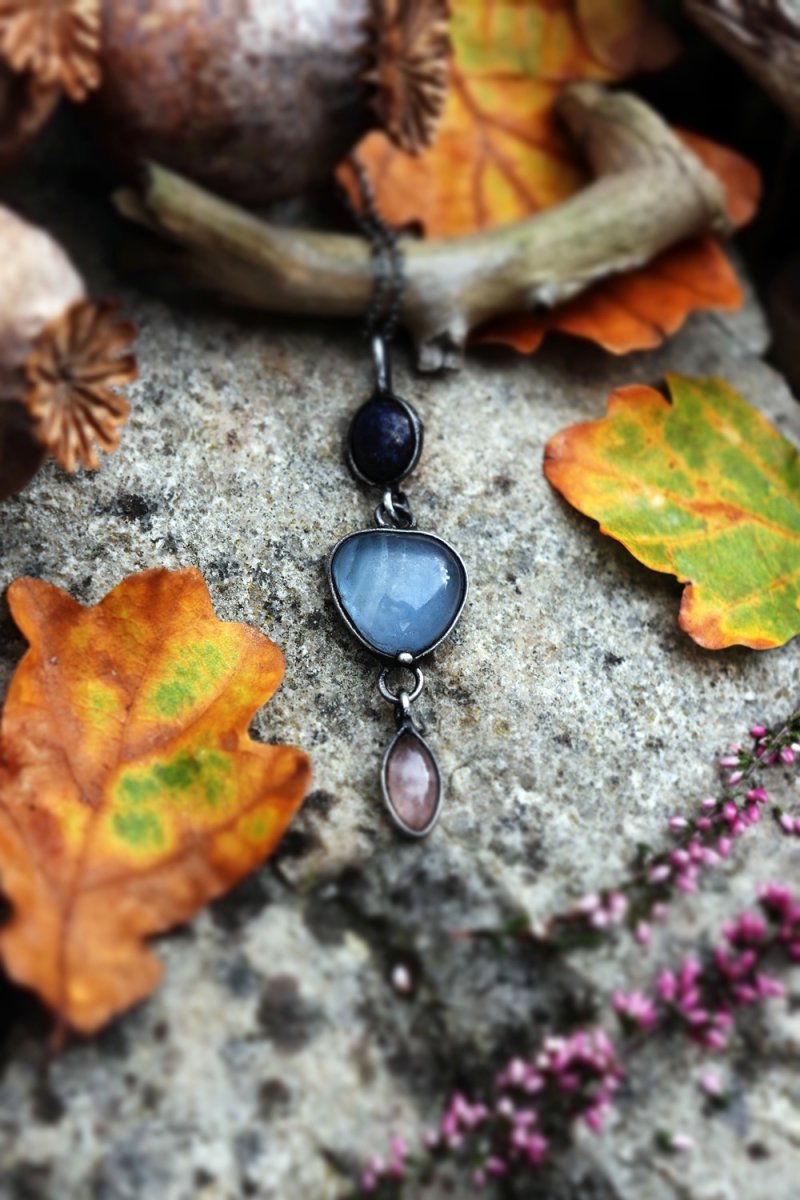 Spojení lapisu lazuli (moudrost a pravda), modrého skla a růženínu (láska a něha) vytváří šperk, který vyrovnává energii těla i mysli. Amulet jako by nesl tajemství hvězdné oblohy.