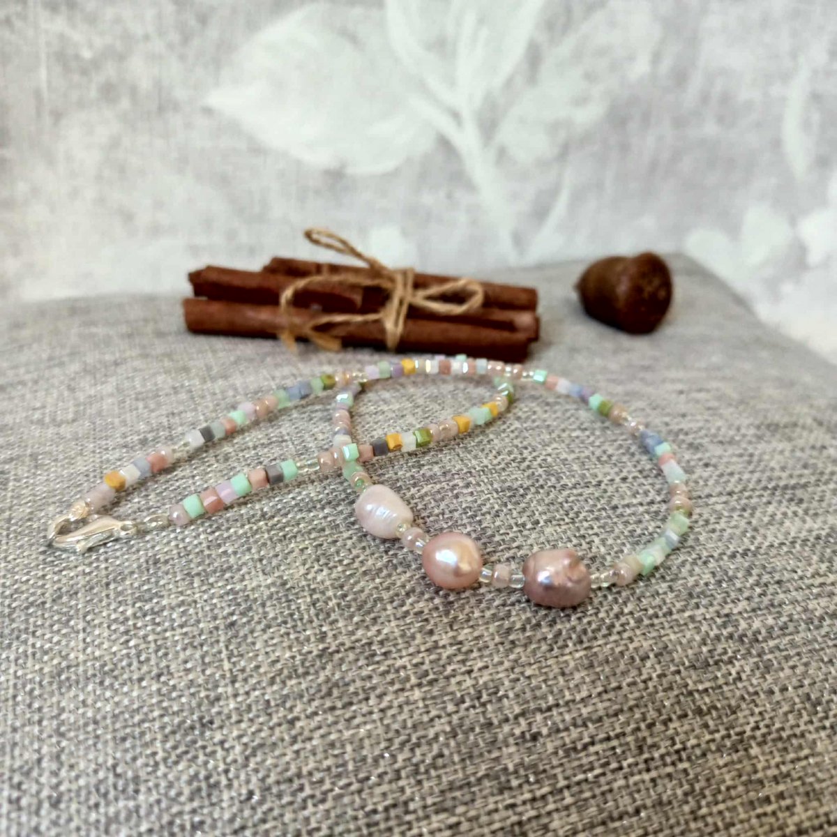 Náhrdelník ze skleněných rokajlových korálků 2mm doplněný skleněnými kostičkami 3mm v pastelových barvách a třemi říčními perlami.