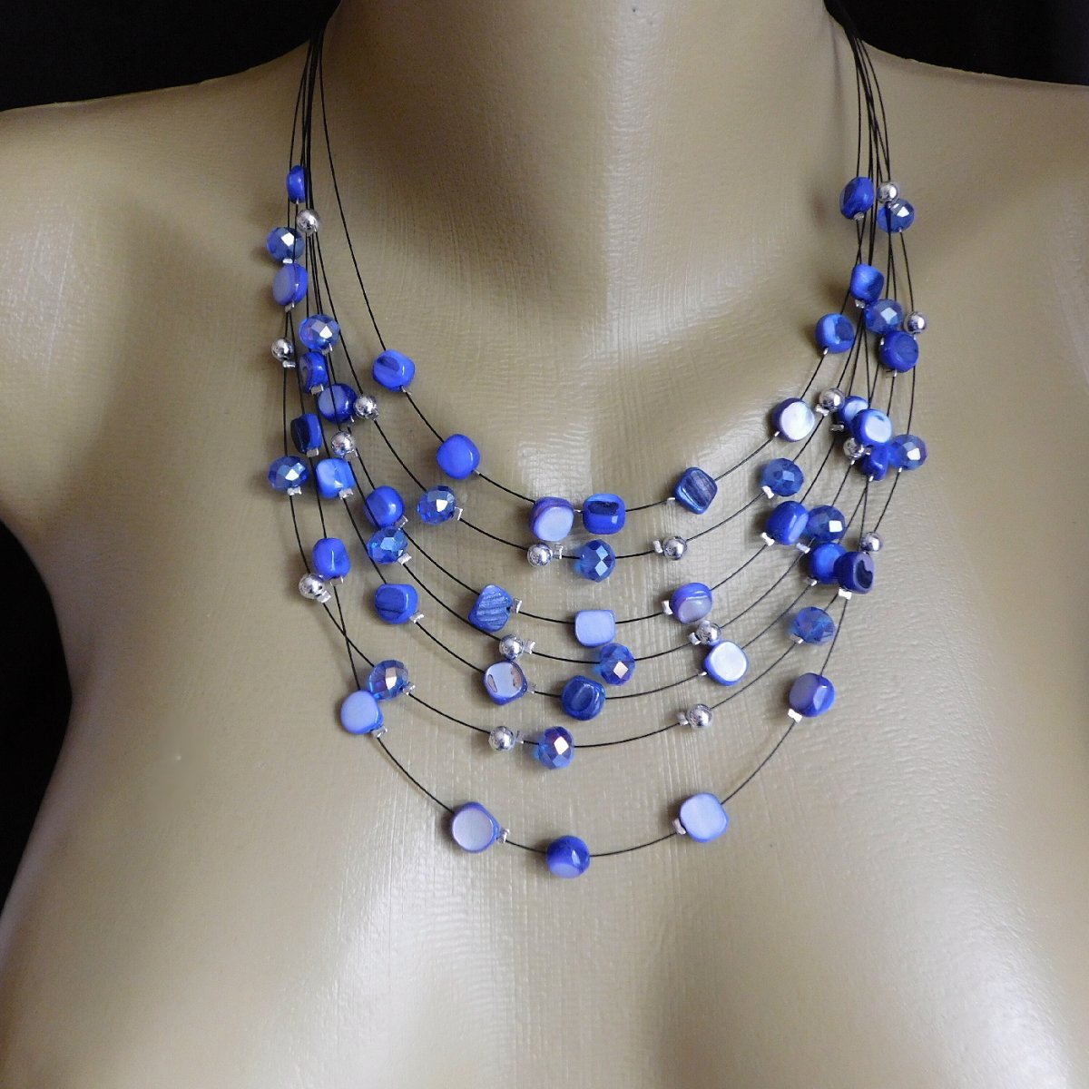 Drobná sekaná modrá perleť, navlečená na silonu. Nejkratší délka 45 cm, řetízek na prodloužení.