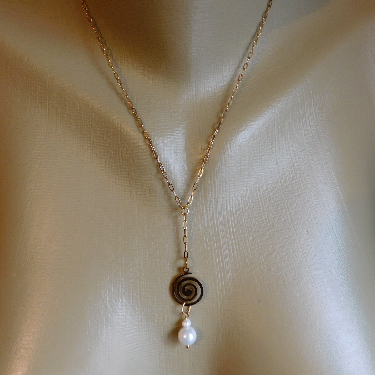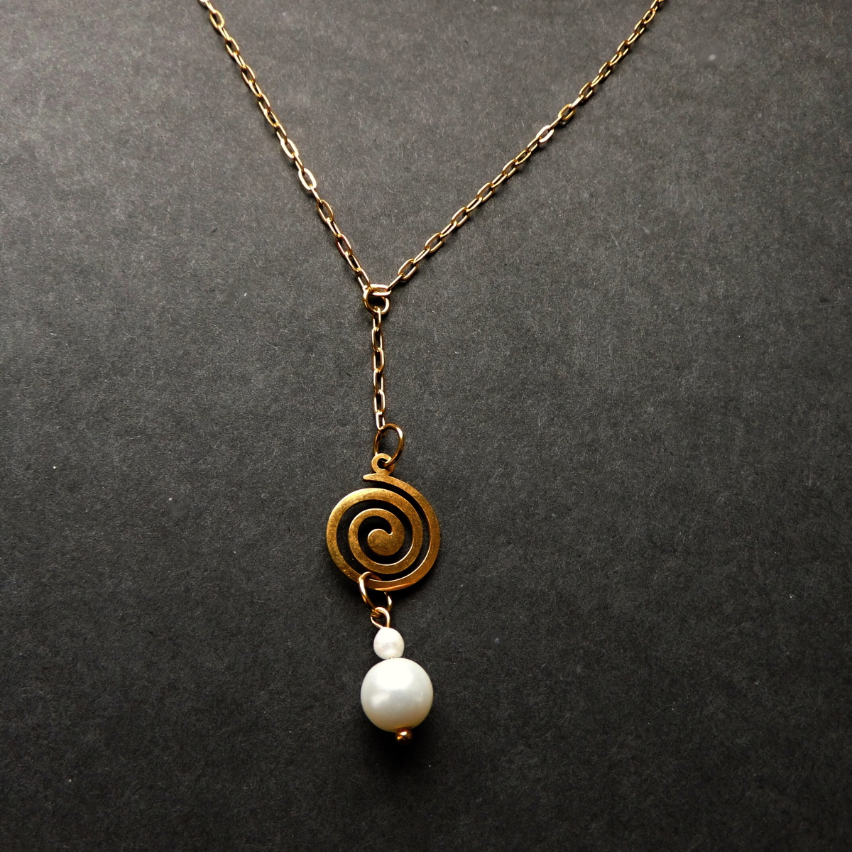 Náhrdelník vyrobený z nerezu ve tvaru Y, pozlacené výše uvedenou metodou. Délka náhrdelníku je 45 cm + necelých 6 cm řetízek ve předu se spirálou /pruměr 13 mm/ se dvěma pravými perličkami, malinkou a větší.