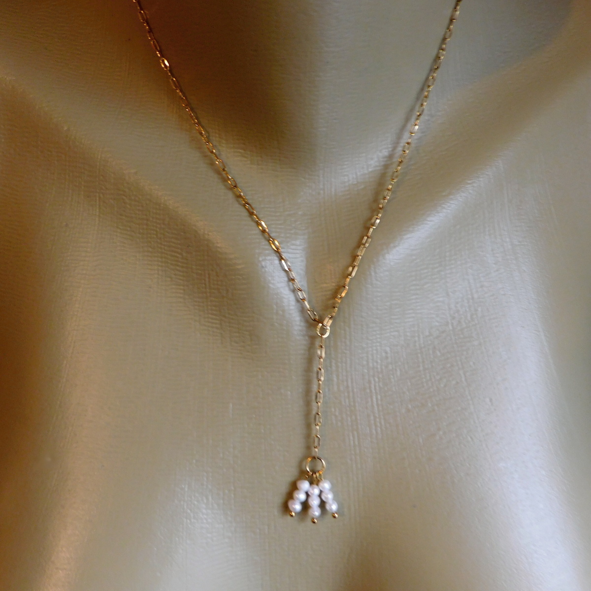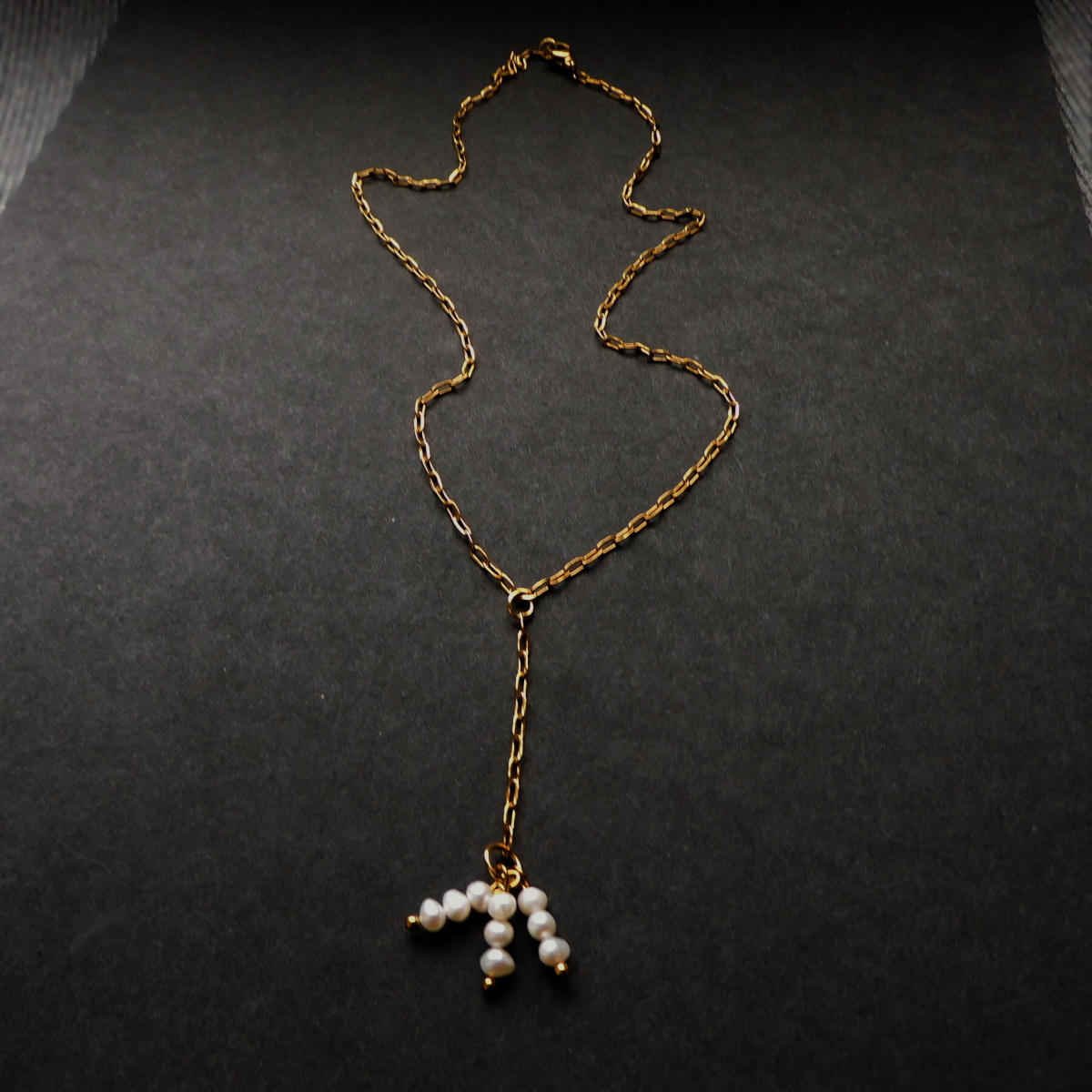 Náhrdelník vyrobený z nerezu ve tvaru Y, pozlacené výše uvedenou metodou. Délka náhrdelníku je 43 cm + necelých 5 cm řetízek ve předu s malinkými pravými perličkami, malinkou a větší..