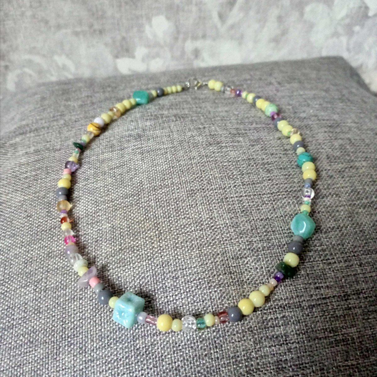 Náhrdelník v jedinečném stylu ze skleněných a akrylových korálků a tromlovaných minerálních kamínků - citrín a chalcedon. Nejmenší korálky mají 3mm a největší délku 10mm.