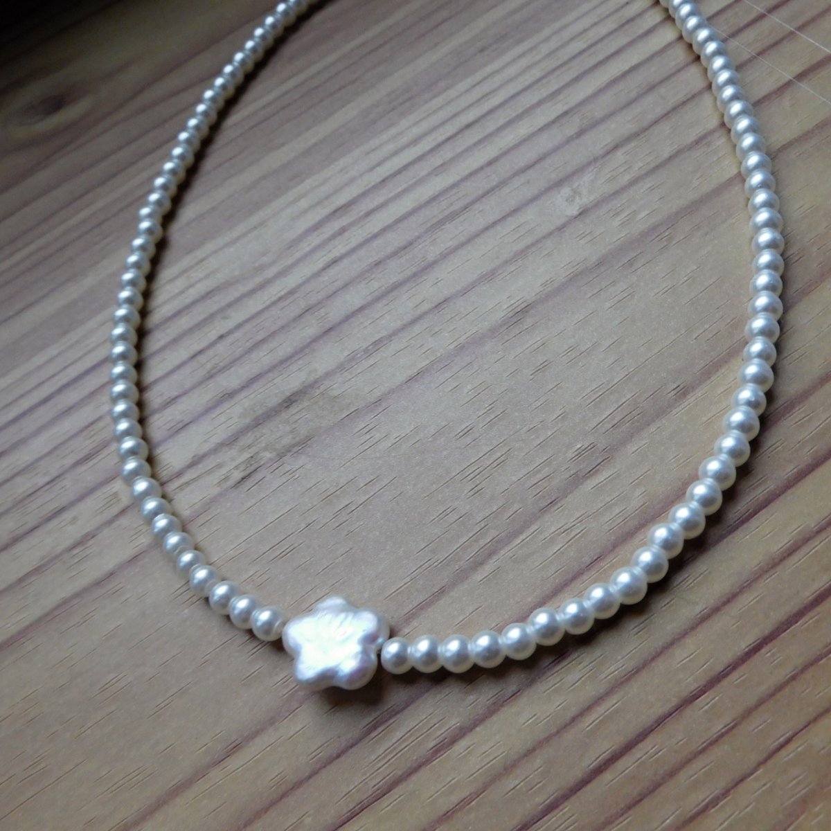 Náhrdelník vyrobený z menších kulatých pravých bilých perliček - velmi pěkné a kvalitní,doplněný malou keshi perlou ve tvaru kytičky