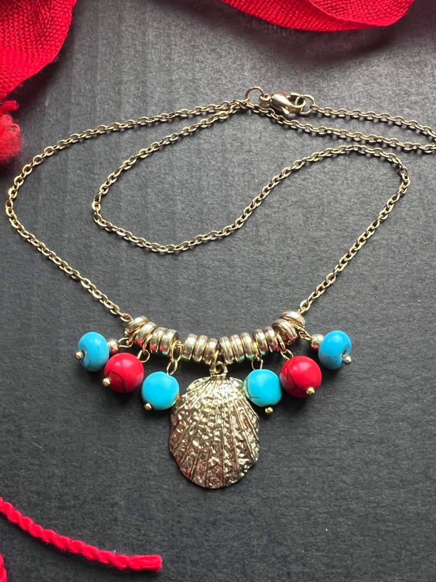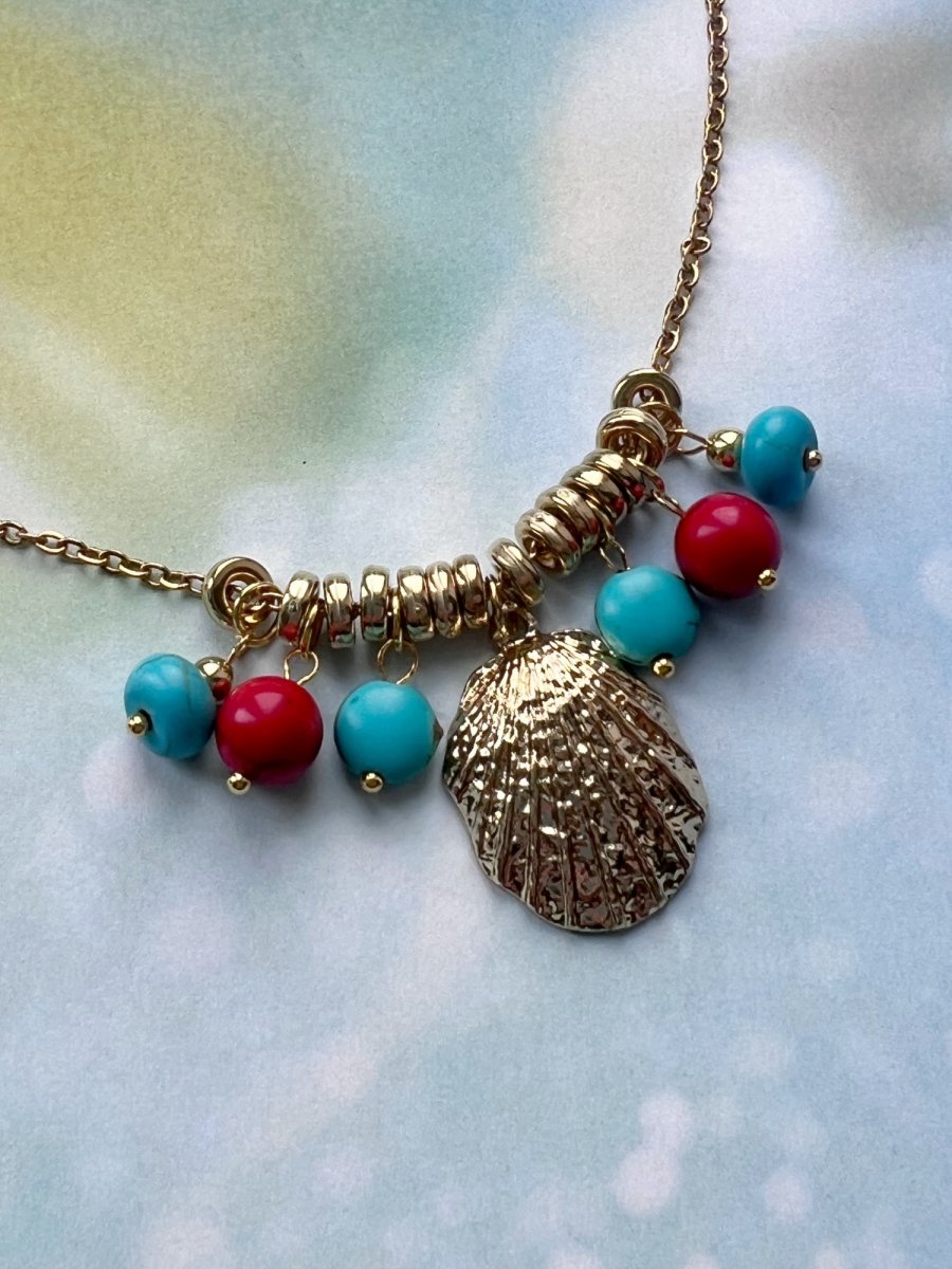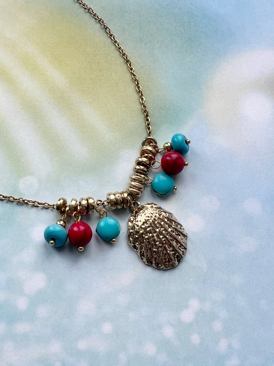 Zlatý přívěskový náhrdelník - mušle a tyrkenitové korálky - přívěsky na tenkém zlatém řetízku. Řetízek je z nerez oceli, zlaté ozdoby běžný kov. Délka 45 cm, zapínání karabinka.