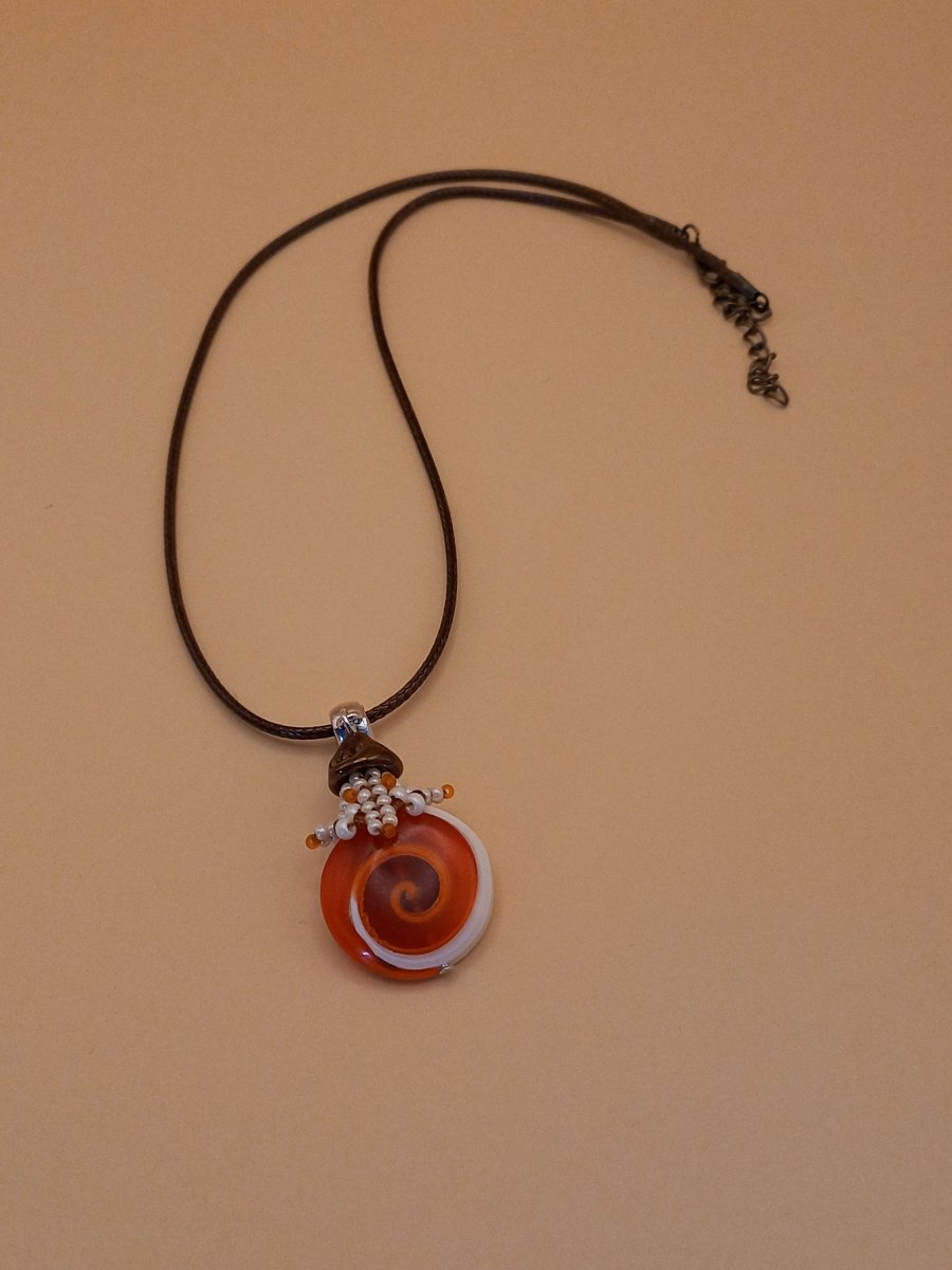 Tento náhrdelník vás okouzlí přívěskem ve tvaru spirály, která kombinuje výrazné barvy červené, béžové a bílé v dokonalém kontrastu. Korálek řez mušle evokuje přírodní mořské motivy. Přívěsek je kulatého tvaru s rozměry 2,5 × 0,5 cm, což z něj činí decentní a jemný doplněk pro každou příležitost. Přívěsek je doplněn šitou korálkovou úchytkovou čepičkou z rokajlu v béžových a hnědých tónech, která přívěsku dodává rafinovaný vzhled.
