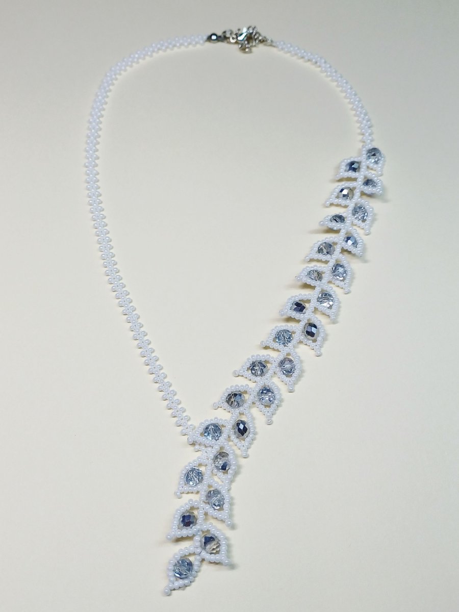 Náhrdelník je šitý z bílých korálků Preciosa, doplněny stříbrno-průhlednými korálky 0,5 cm