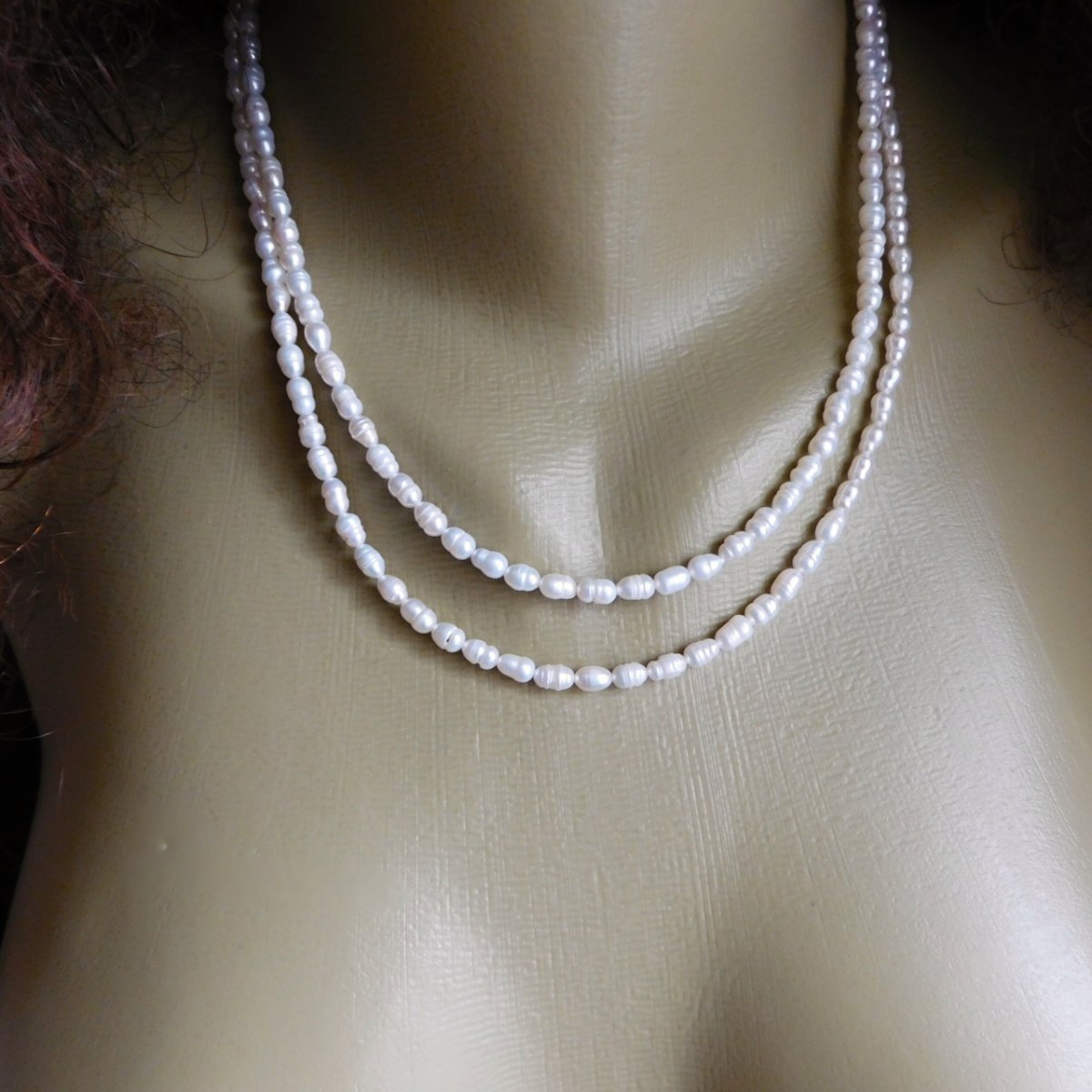 Náhrdelník, dvě řady, vyrobený z malých oválných nepravidelných pravých bilých perliček - velmi pěkné a oblíbené