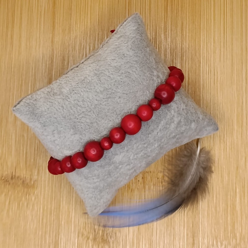 Náramek navlékaný z dřevěných korálků a tkaný technikou macramé z nylonové šňůry.Korálky jsou průměru 4, 6, 8 a 10 mm.Neobsahuje žádný kov - vhodný pro alergiky.
