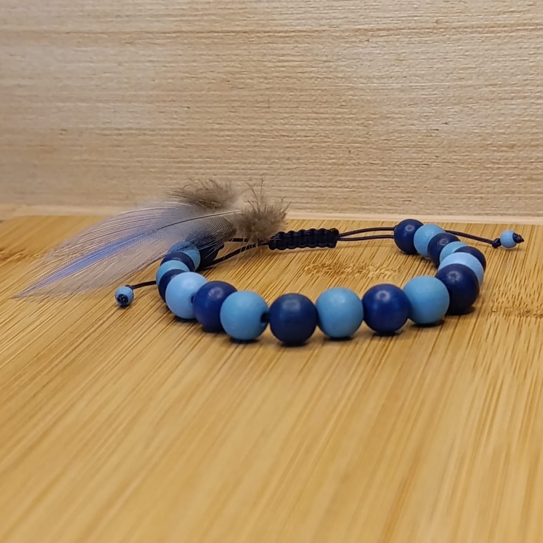 Náramek navlékaný z dřevěných korálků a tkaný technikou macramé z nylonové šňůry.Korálky jsou průměru 4, 8 a 10 mm.Neobsahuje žádný kov - vhodný pro alergiky.