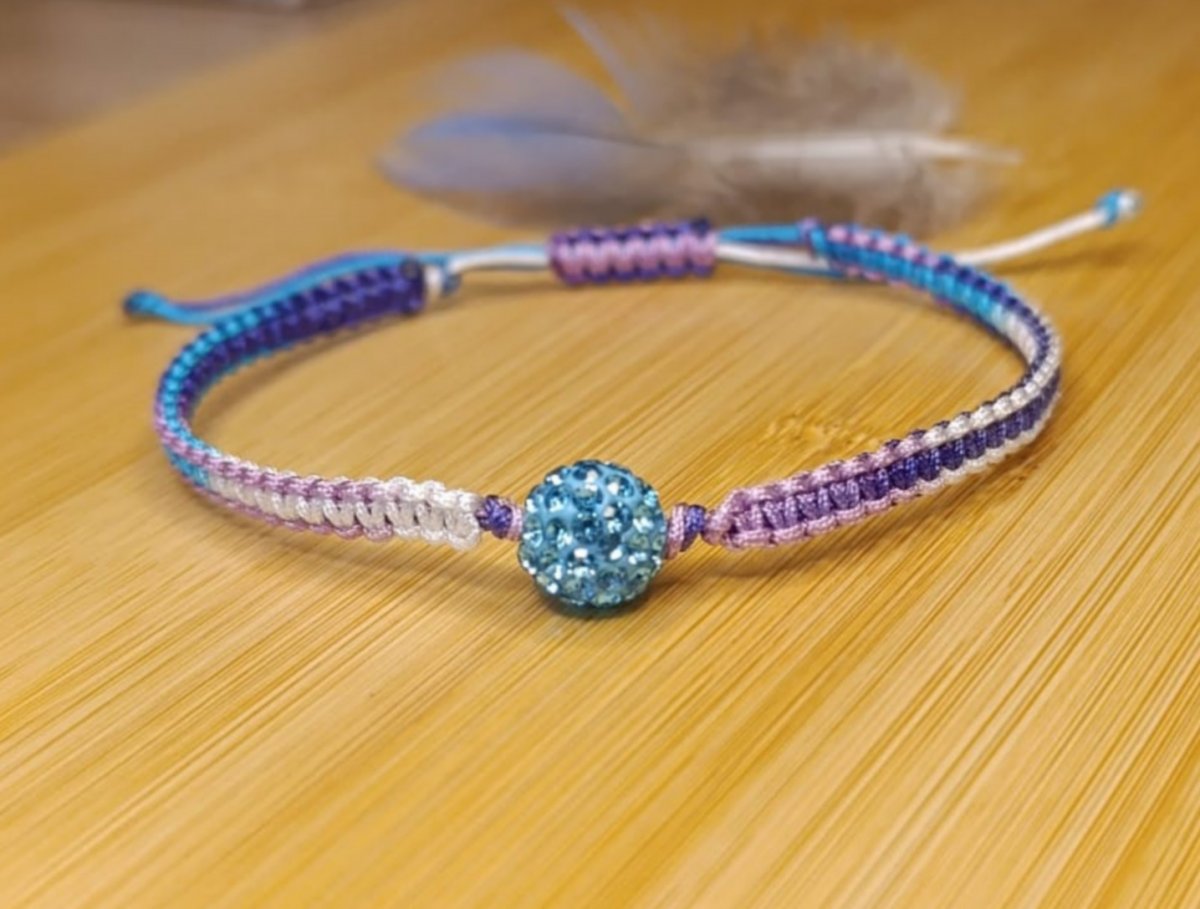 Náramek tkaný technikou macramé z melírované nylonové šňůry, uprostřed shamballa korálek.Posuvné zapínání.Korálek není kovový - vhodné pro alergiky.