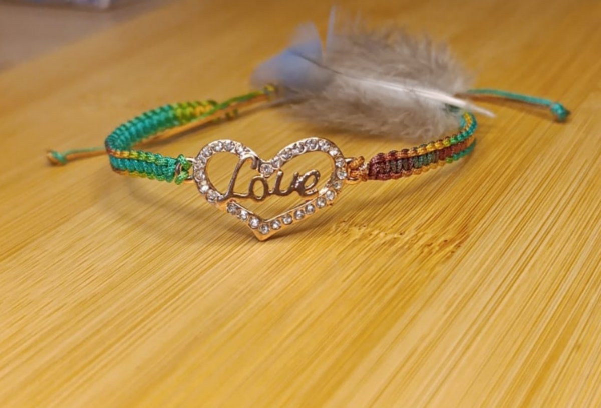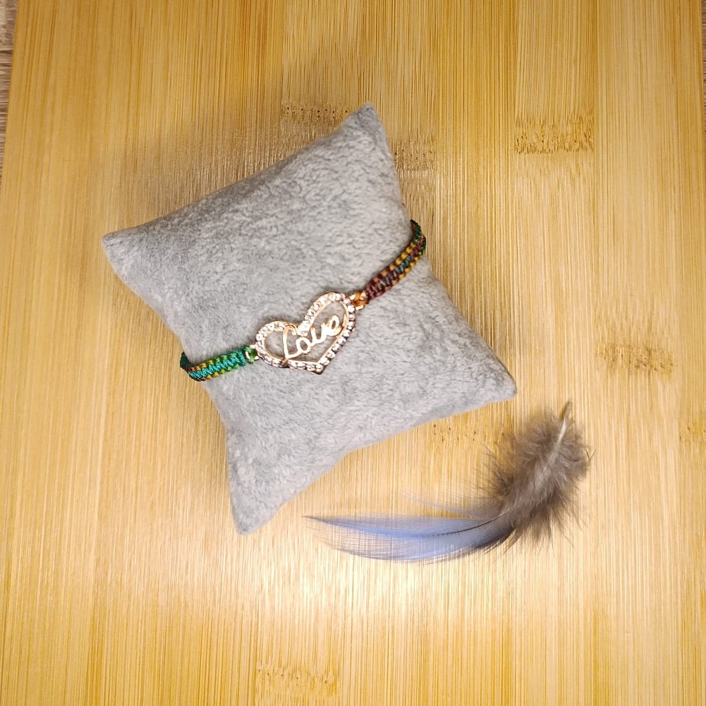 Náramek tkaný technikou macramé z melírované nylonové šňůry, uprostřed kovové srdíčko LOVE.