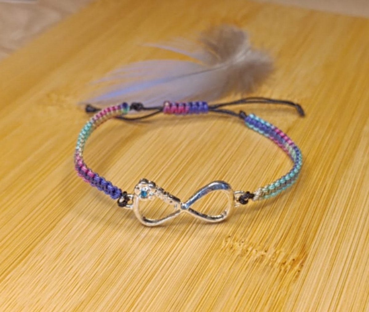 Náramek tkaný technikou macramé z duhové nylonové šňůry, uprostřed kovové nekonečno.Posuvné zapínání.Nekonečno je z bižuterního kovu v barvě stříbrné se štrasem.