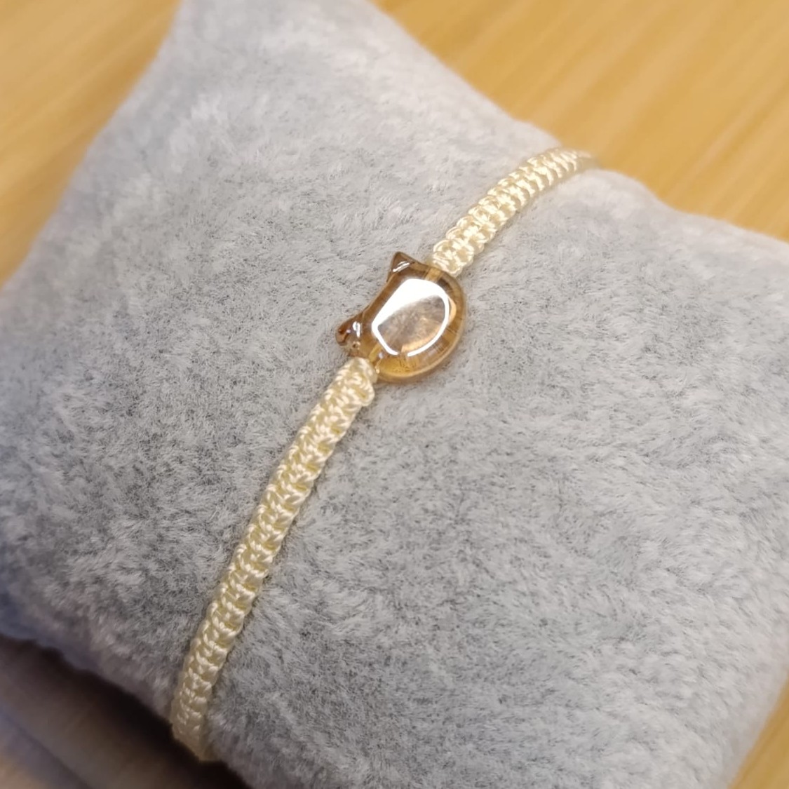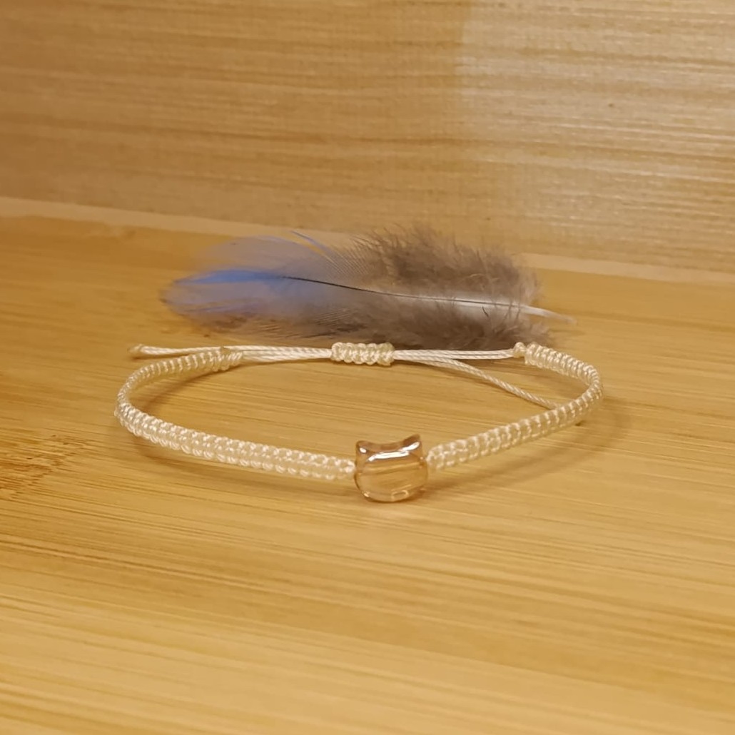 Náramek tkaný technikou macramé z C-lonu odstín cream, skleněná hlava kočičky v barvě průsvitná žlutá.
