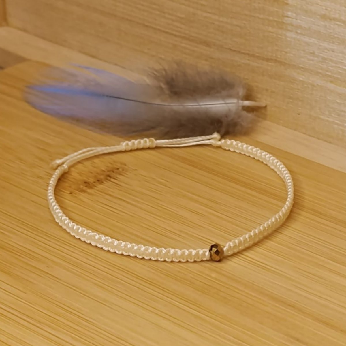 Náramek tkaný technikou macramé z C-lonu odstín cream, skleněná broušená rondelka v barvě zlatá.