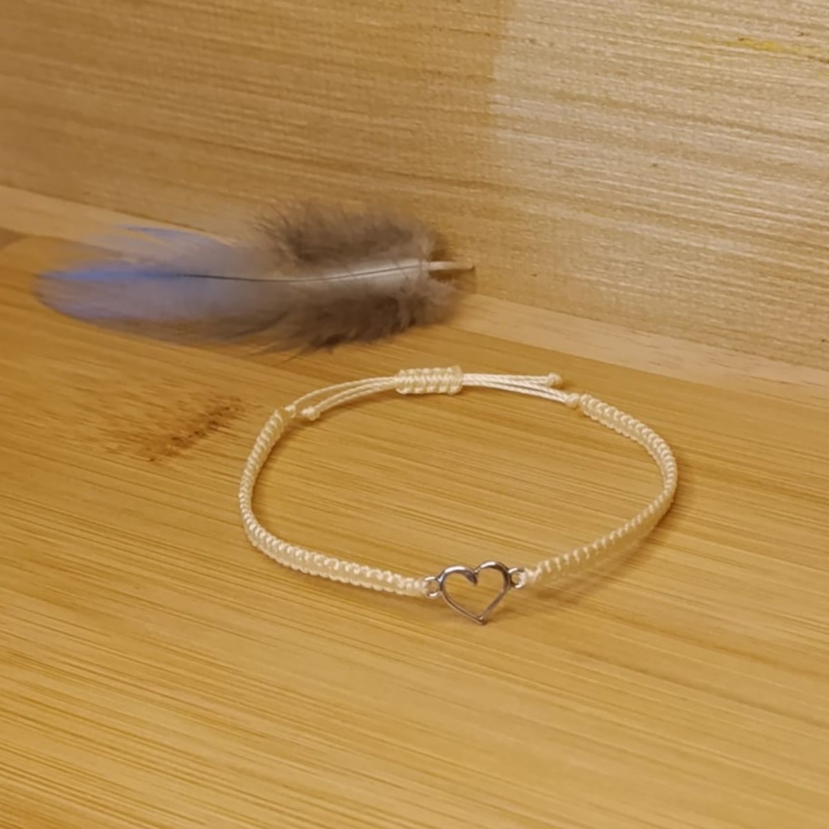 Náramek tkaný technikou macramé z C-lonu odstín cream, uprostřed kovové srdíčko stříbrné barvy.Posuvné zapínání.Srdíčko je z bižuterního kovu.