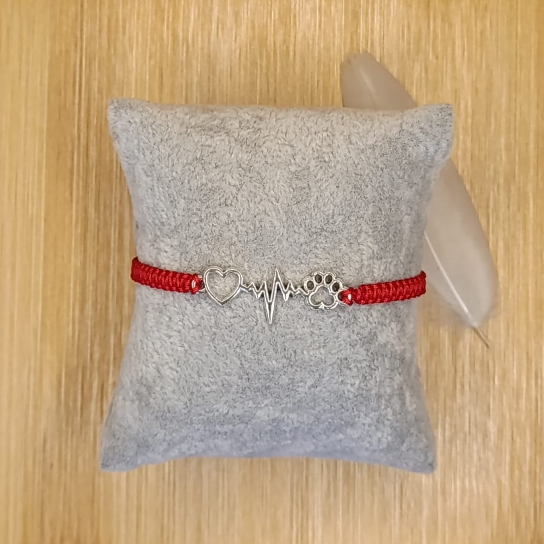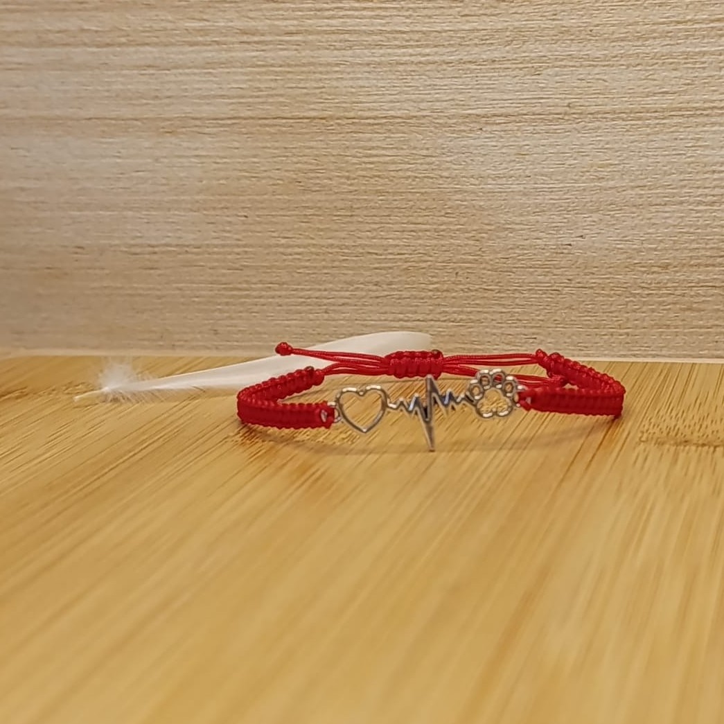 Náramek tkaný technikou macramé z nylonové šňůry červené barvy, uprostřed kovový přívěsek srdíčko + srdeční tep + tlapka ve stříbrné barvě.
