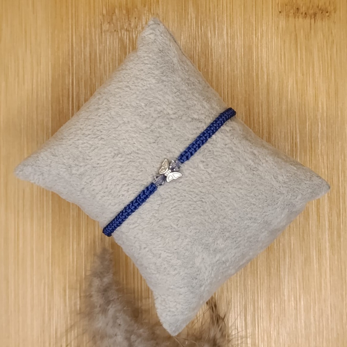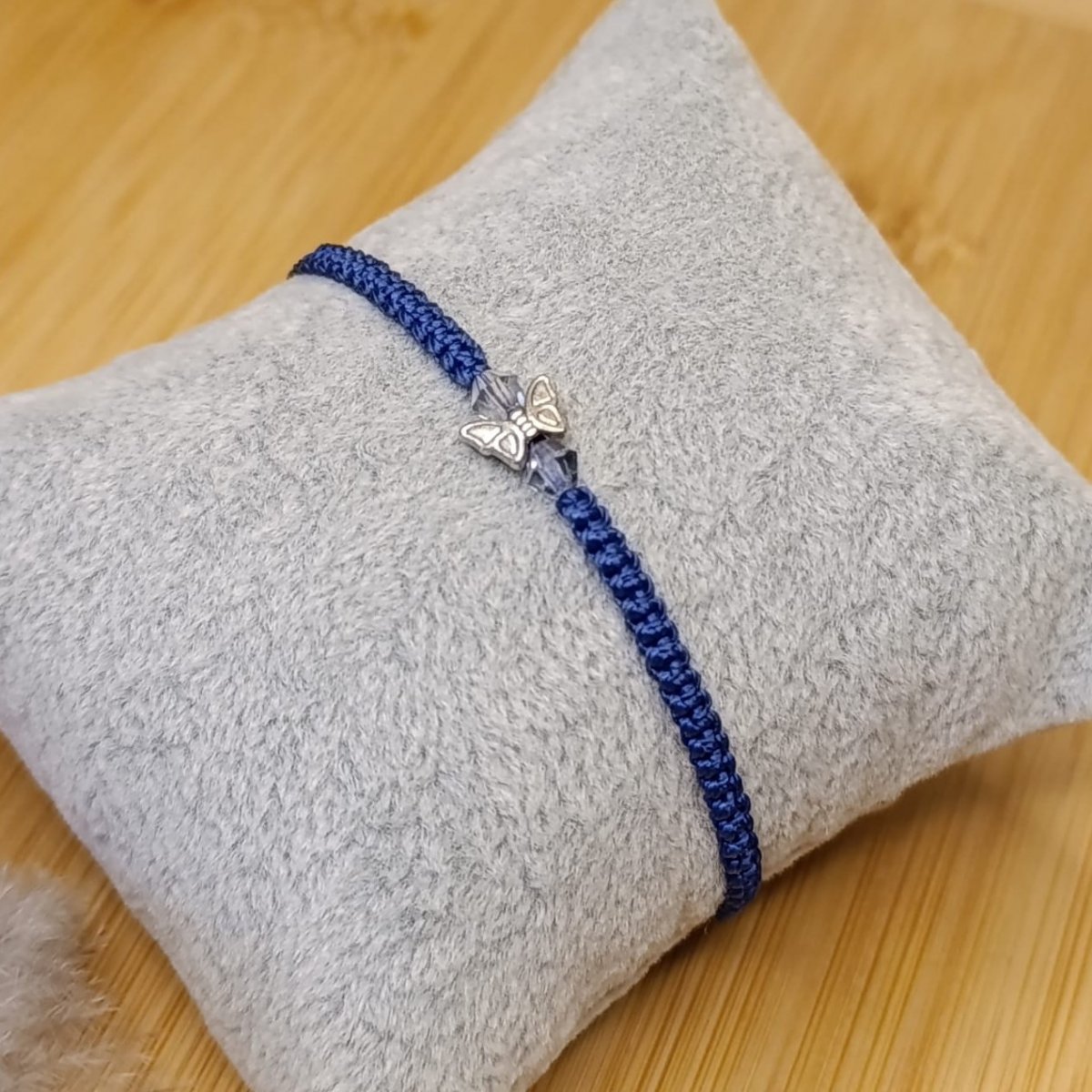 Náramek tkaný technikou macramé z C-lonu odstín capri blue, broušený modrý bicone korálek a stříbrný kovový motýlek.Posuvné zapínání.