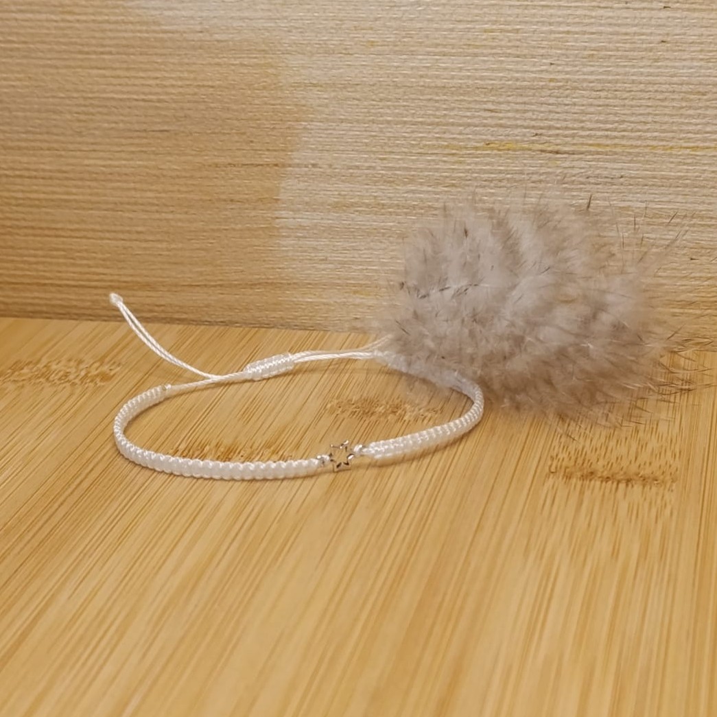 Náramek tkaný technikou macramé z C-lonu odstín white, kovová hvězdička.Posuvné zapínání.