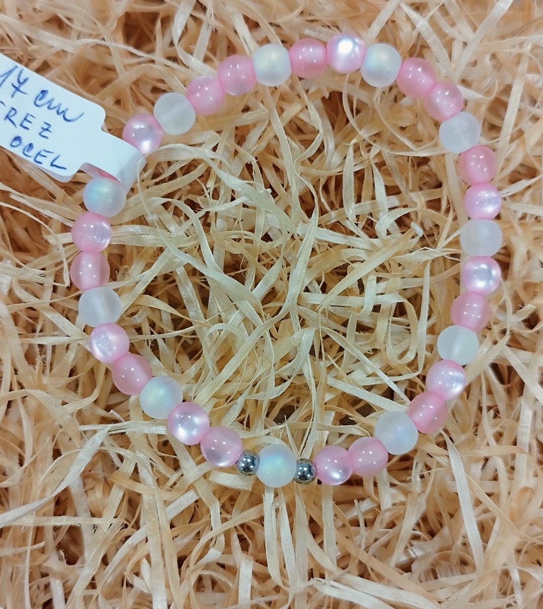 Barva: světlejší růžová, v kombinaci s bílou, efekt duhování, 2 kovové korálky z nerez oceli