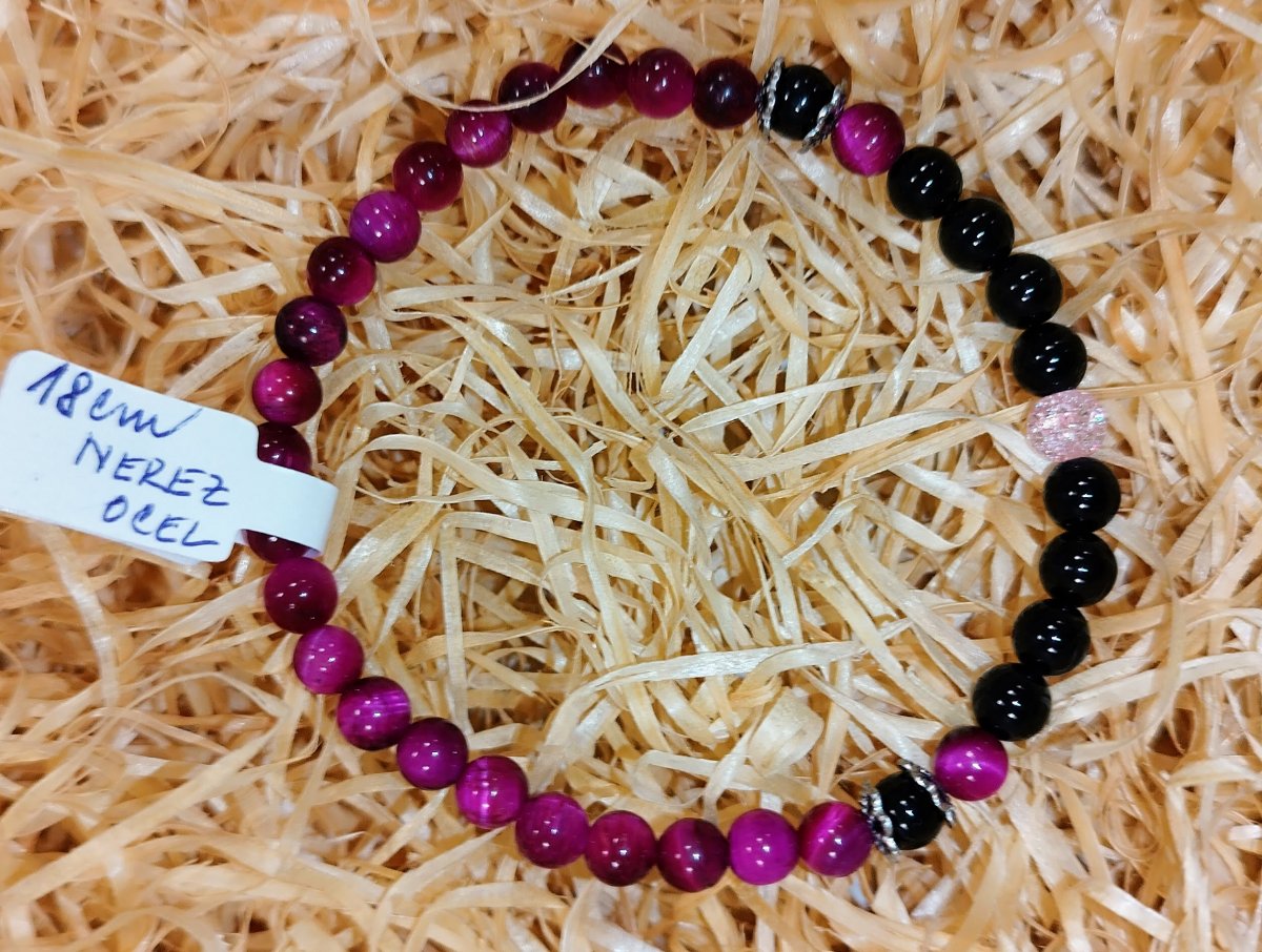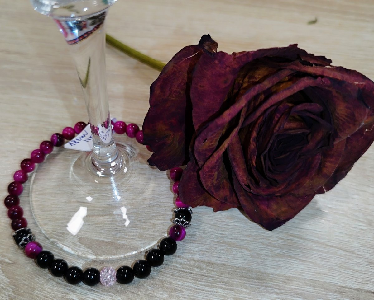 Barva: Tmavě růžová až bordó v kombinaci s černou, 1 korálek světle růžový - práskané sklo