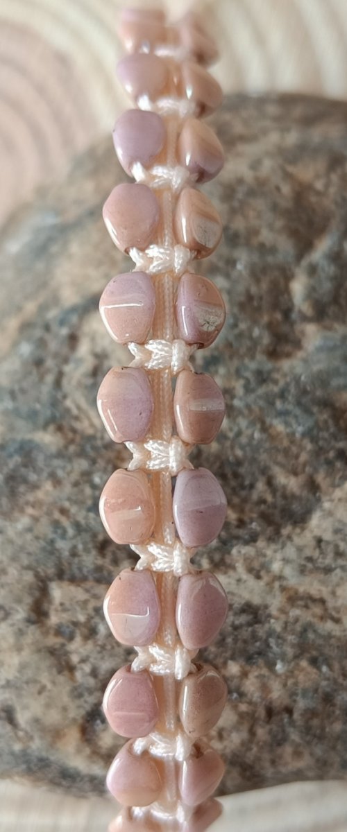 Náramek je vyroben z nylonové šňůry meruňkové barvy. Dále skleněnými korálky.