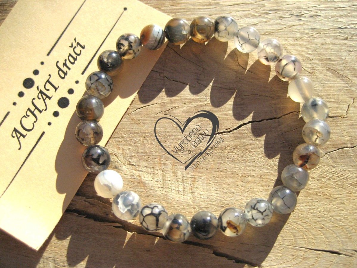 Náramek z minerálu Achát dračí, velikost korálků 8mm, obvod cca 18-18,5cm, kuličky jsou navlečeny na elastické gumičce - lycře, foto je ilustrační, protože každý náramek je originál, tudíž se může nepatrně lišit odstínem barvy či velikosti minerálních kuliček. K náramku mám v nabídce i náušnice.
