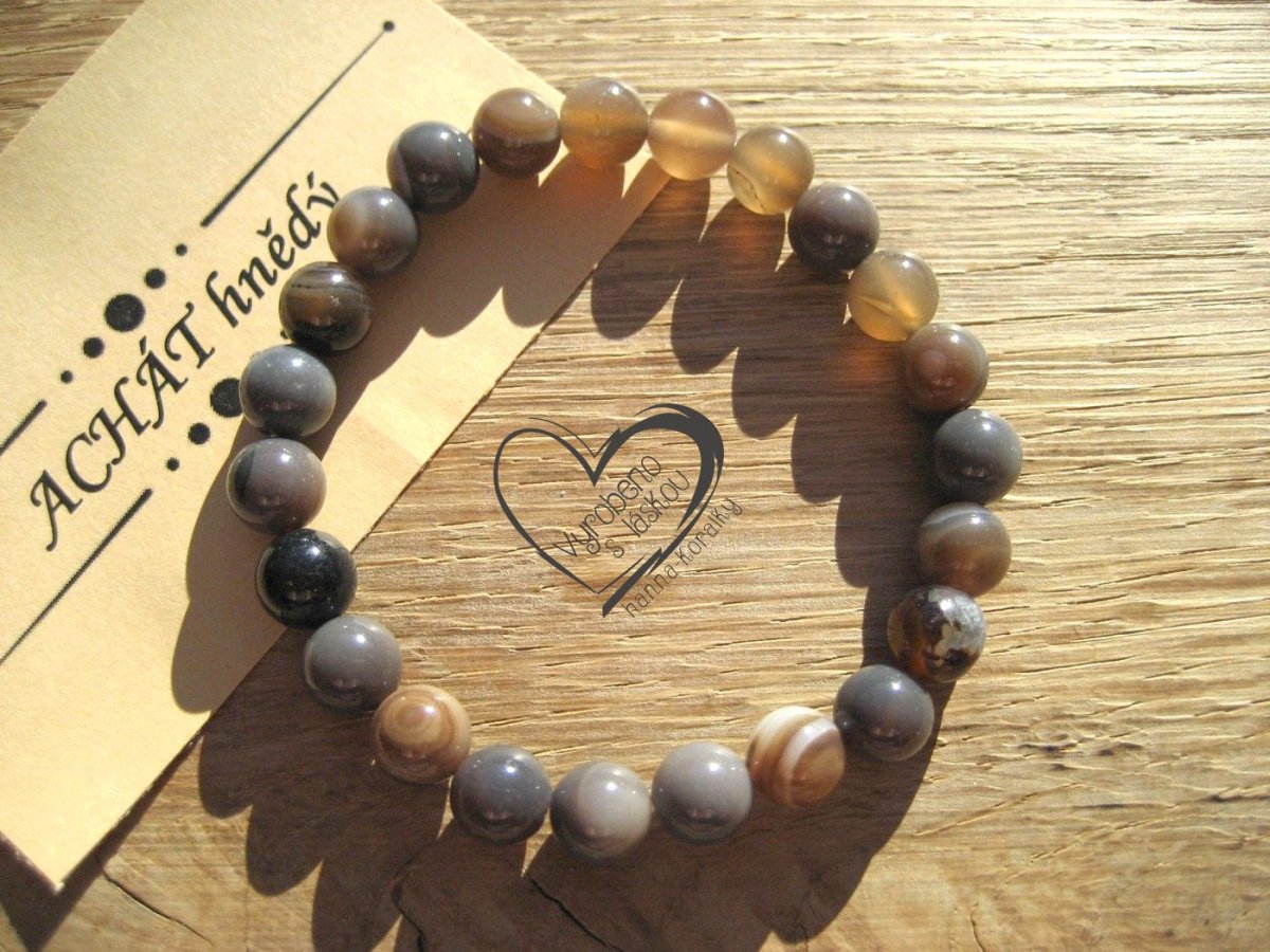 Náramek z minerálu Achát hnědý, velikost korálků 8mm, obvod cca 18-18,5cm, kuličky jsou navlečeny na elastické gumičce - lycře, foto je ilustrační, protože každý náramek je originál, tudíž se může nepatrně lišit odstínem barvy či velikosti minerálních kuliček.