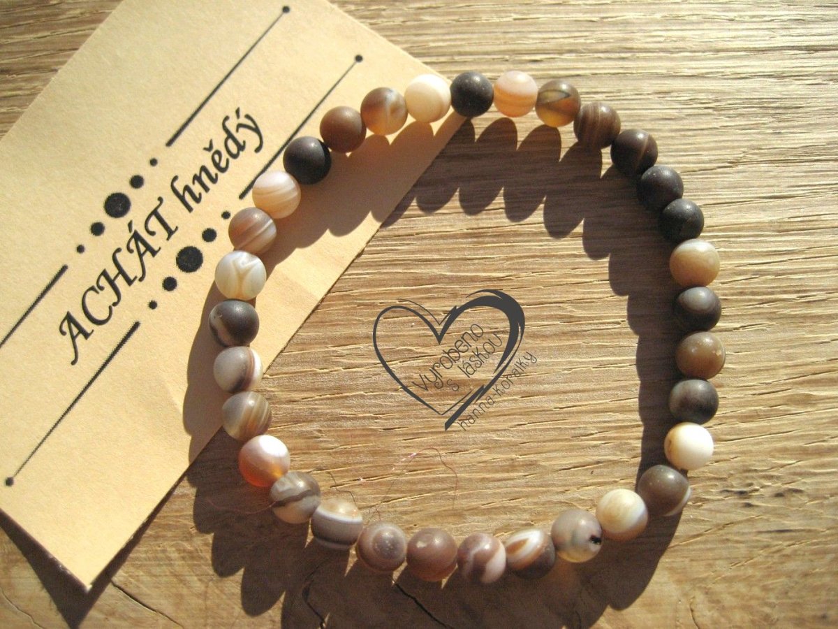 Náramek z minerálu Achát hnědý matný, velikost korálků 6mm, obvod cca 18-18,5cm, kuličky jsou navlečeny na elastické gumičce - lycře, foto je ilustrační, protože každý náramek je originál, tudíž se může nepatrně lišit odstínem barvy či velikosti minerálních kuliček.