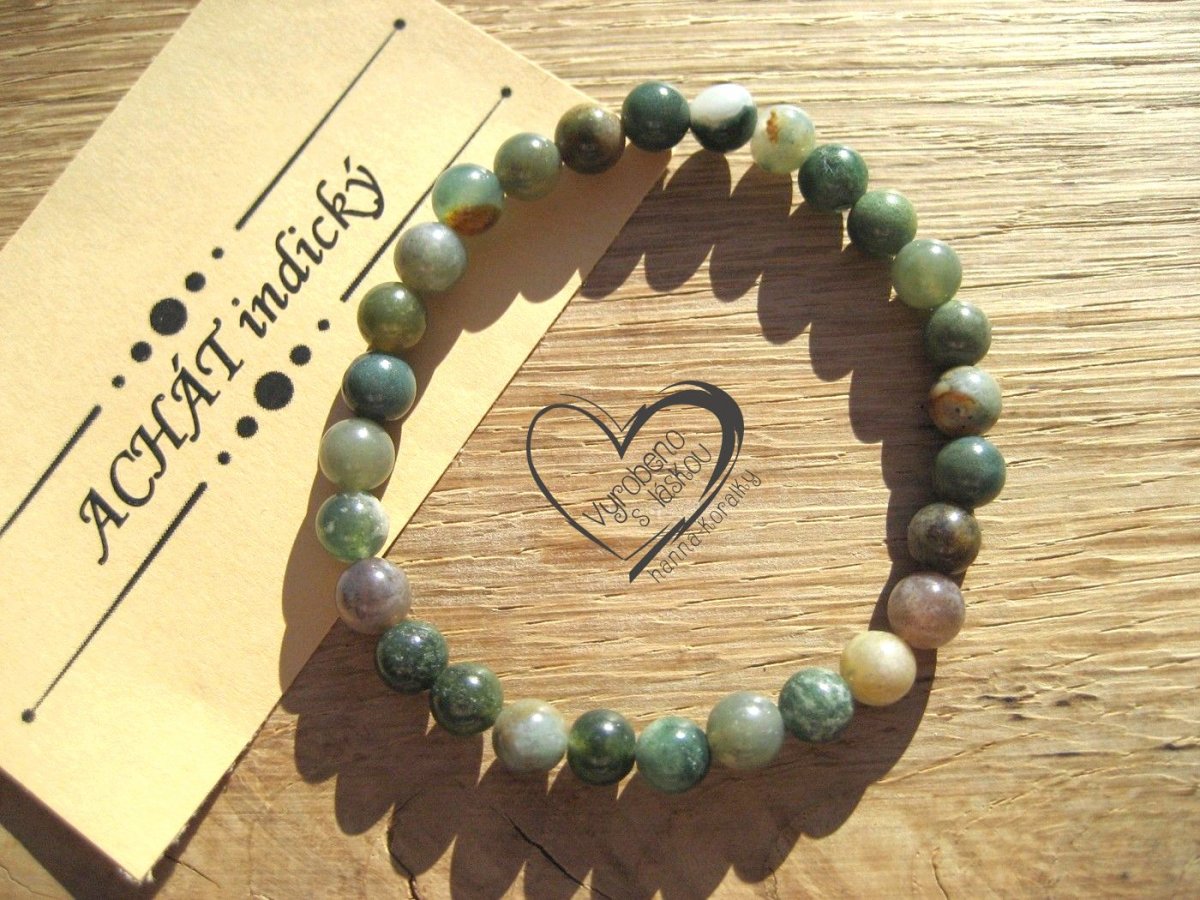 Náramek z minerálu Achát indický, velikost korálků 6mm, obvod cca 18-18,5cm, kuličky jsou navlečeny na elastické gumičce - lycře, foto je ilustrační, protože každý náramek je originál, tudíž se může nepatrně lišit odstínem barvy či velikosti minerálních kuliček.