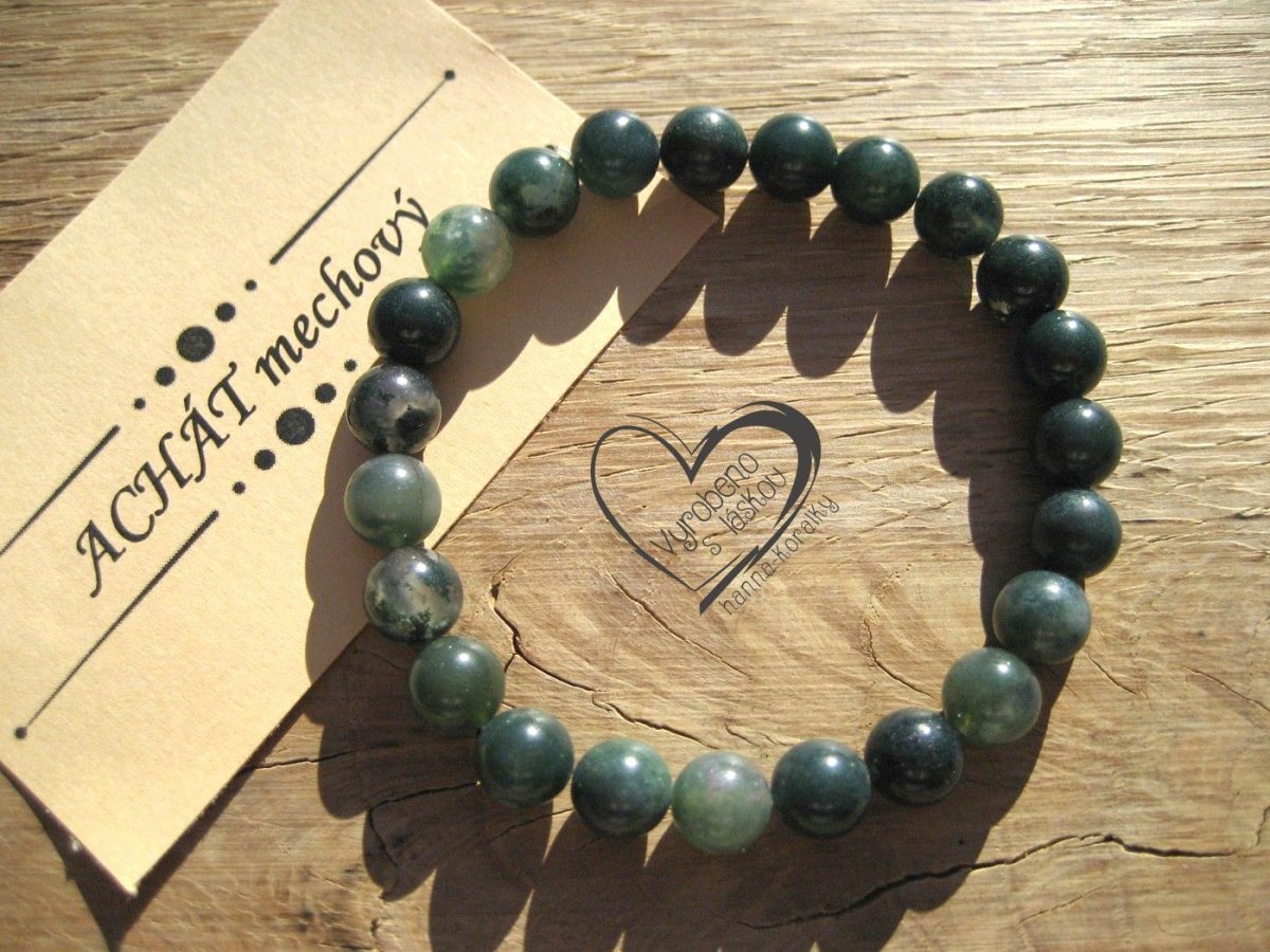 Náramek z minerálu Achát mechový, velikost korálků 8mm, obvod cca 18-18,5cm, kuličky jsou navlečeny na elastické gumičce - lycře, foto je ilustrační, protože každý náramek je originál, tudíž se může nepatrně lišit odstínem barvy či velikosti minerálních kuliček.