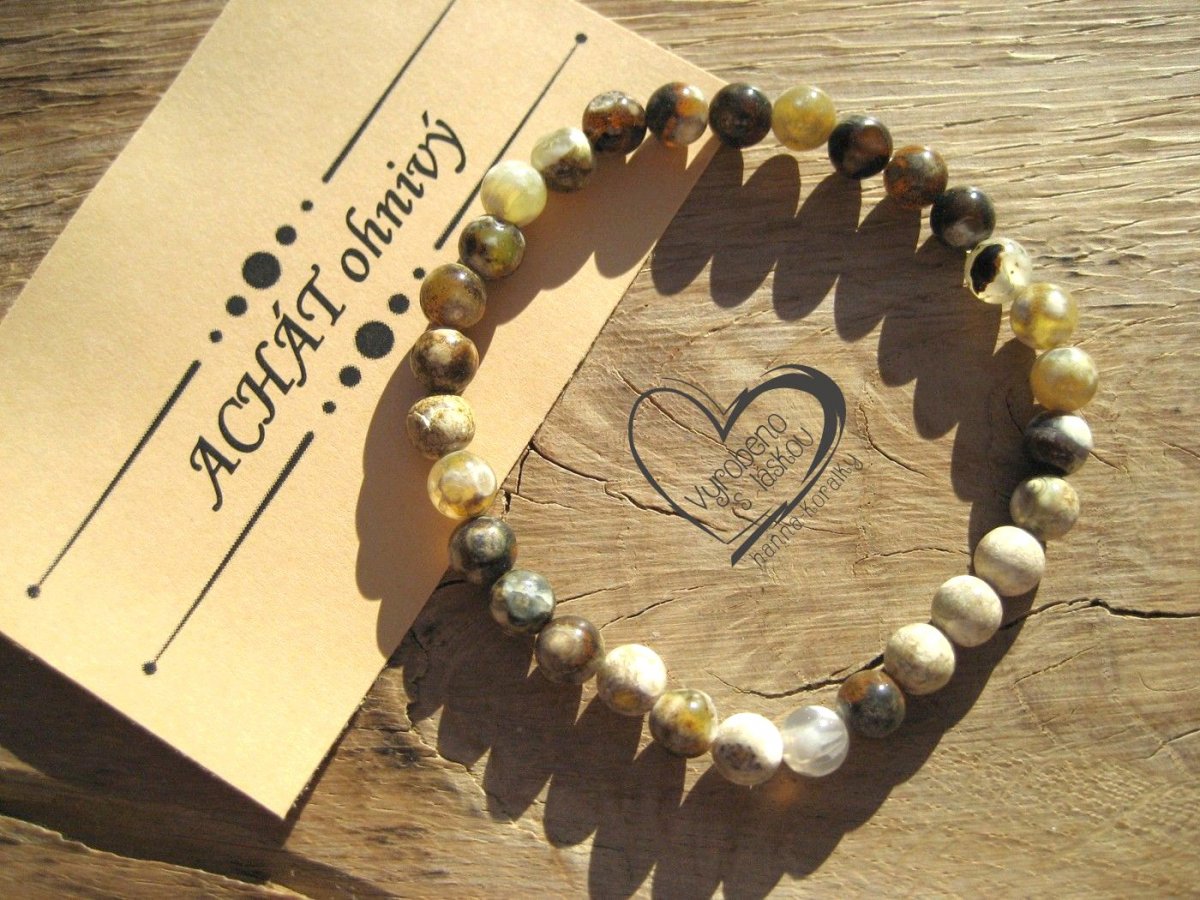 Náramek z minerálu Achát ohnivý, velikost korálků 6mm, obvod cca 18-18,5cm, kuličky jsou navlečeny na elastické gumičce - lycře, foto je ilustrační, protože každý náramek je originál, tudíž se může nepatrně lišit odstínem barvy či velikosti minerálních kuliček.