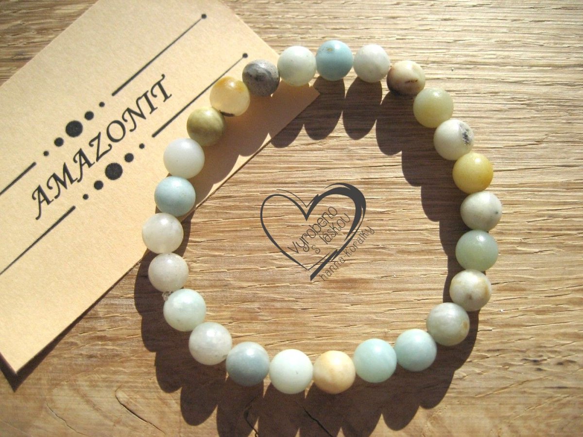 Náramek z minerálu Amazonit, velikost korálků 8mm, obvod cca 18-18,5cm, kuličky jsou navlečeny na elastické gumičce - lycře, foto je ilustrační, protože každý náramek je originál, tudíž se může nepatrně lišit odstínem barvy či velikosti minerálních kuliček.