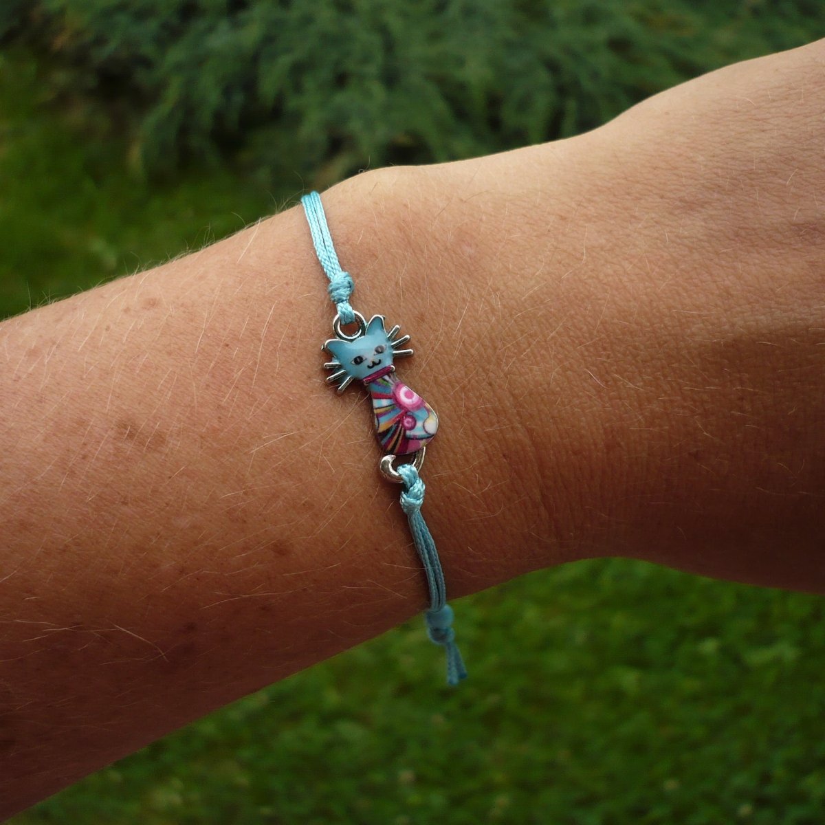 Oblíbený stahovací náramek na dvojité modré šňůrce se smaltovanou malou kočičkou.
