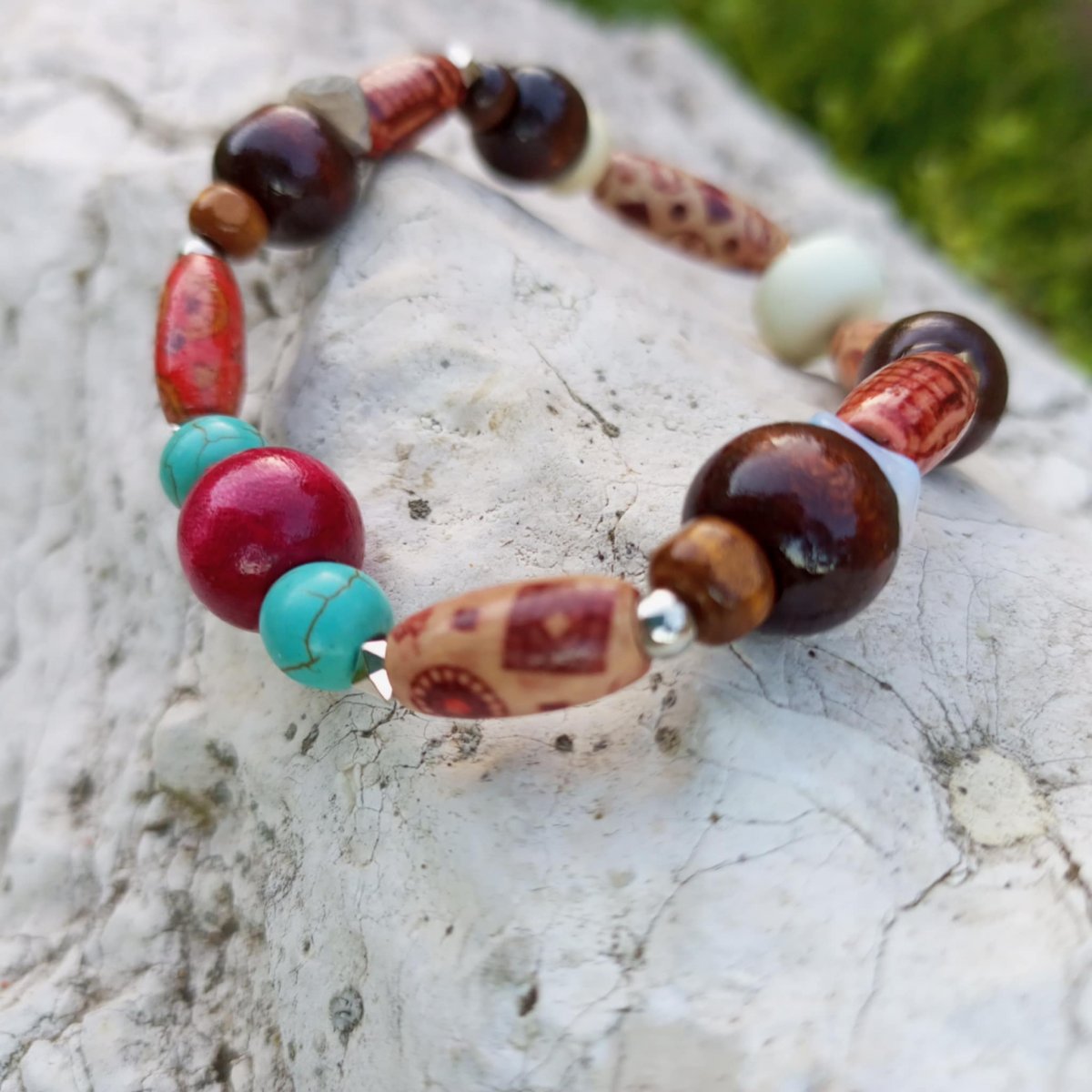 Pánský stylový náramek se dřevěnými korálky, korálky z CCB materiálu,dvou keramických tyrkysových korálků a ze dvou minerálních tromlovaných kamínků Akvamarínu a Záhnědy.