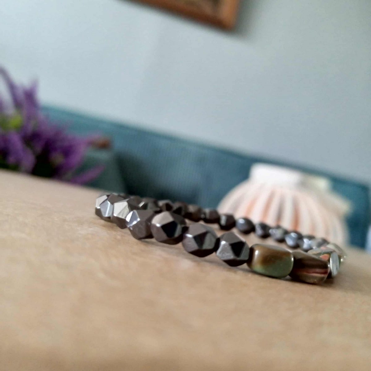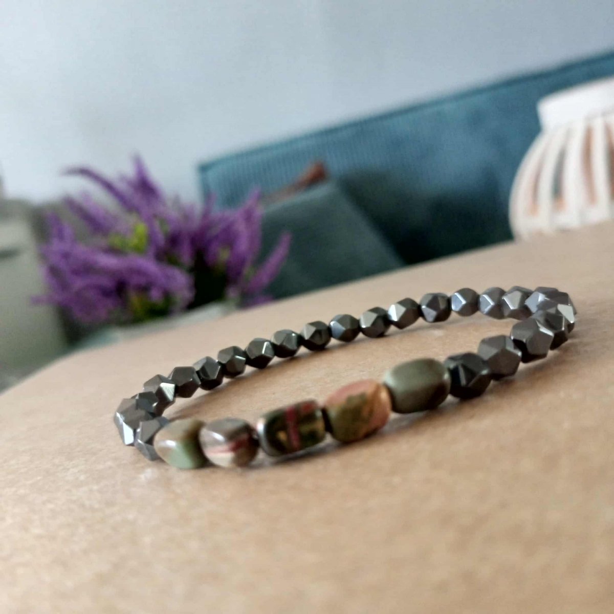 Náramek z korálků z fasetovaného hematitu cca 6mm , cihliček jaspisu picasso 5x7mm.