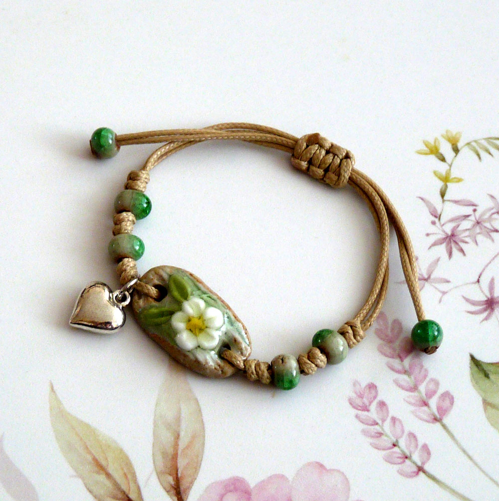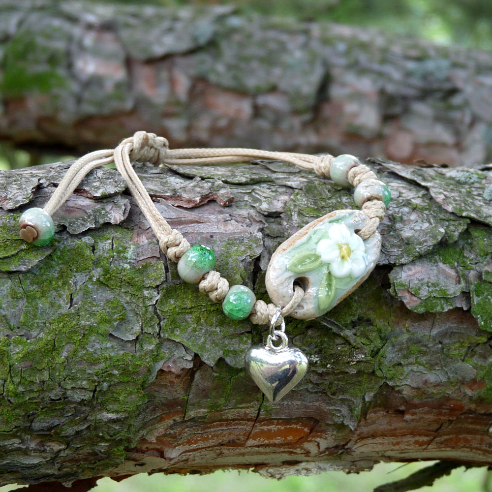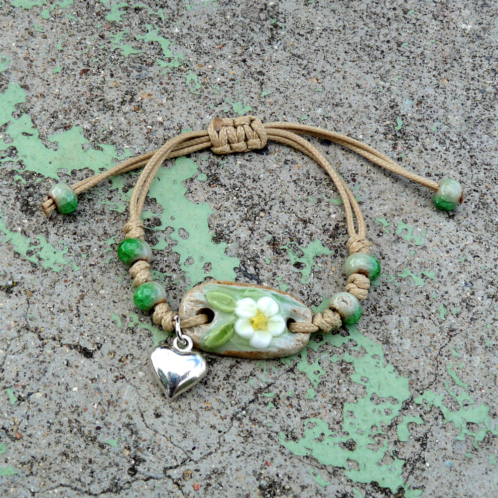 Je tvořený šňůrkami, na kterých je navlečený větší keramický korálek s bílým kvítkem ozdobený stříbrným srdíčkem.