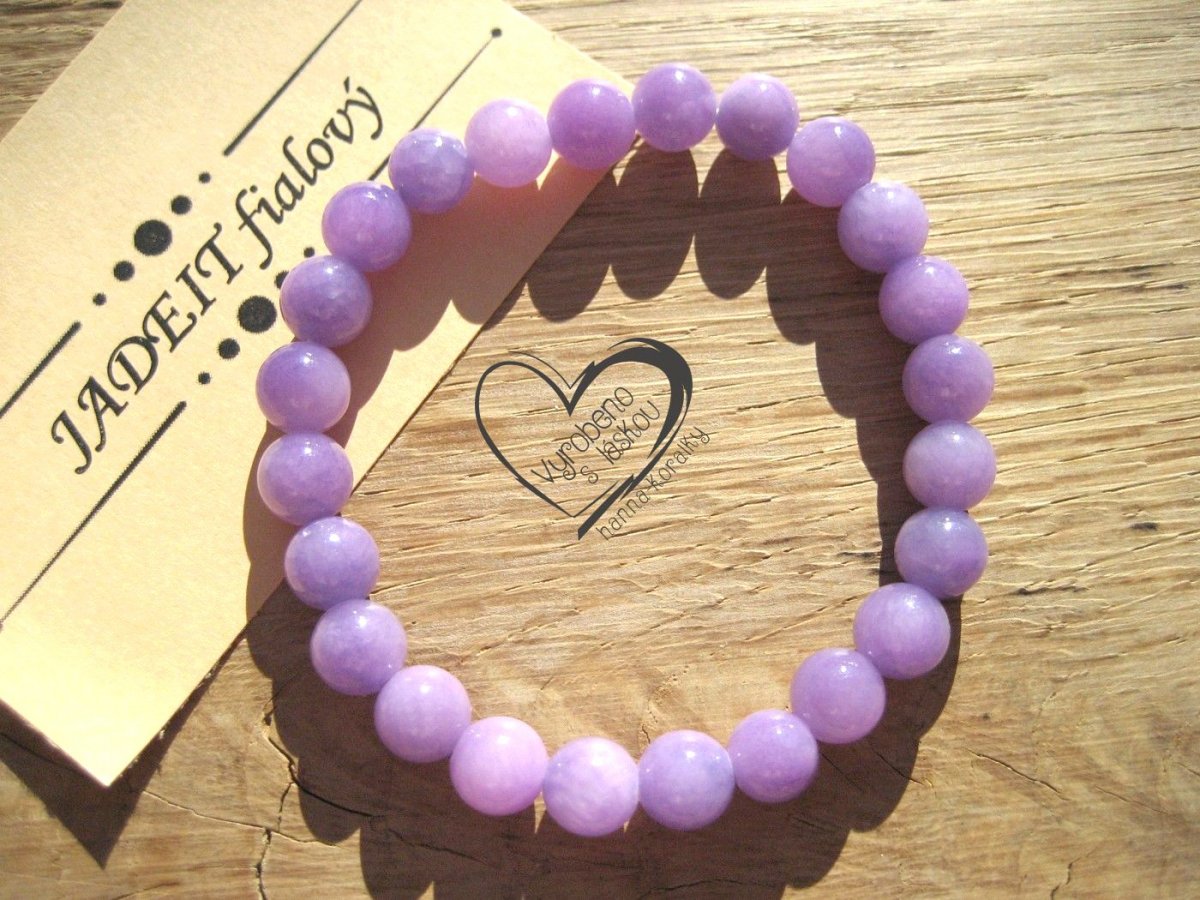 Náramek z minerálu Jadeit fialový, velikost korálků 8mm, obvod cca 18-18,5cm, kuličky jsou navlečeny na elastické gumičce - lycře, foto je ilustrační, protože každý náramek je originál, tudíž se může nepatrně lišit odstínem barvy či velikosti minerálních kuliček.