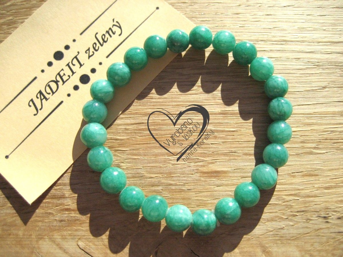 Náramek z minerálu Jadeit zelený, velikost korálků 8mm, obvod cca 18-18,5cm, kuličky jsou navlečeny na elastické gumičce - lycře, foto je ilustrační, protože každý náramek je originál, tudíž se může nepatrně lišit odstínem barvy či velikosti minerálních kuliček.