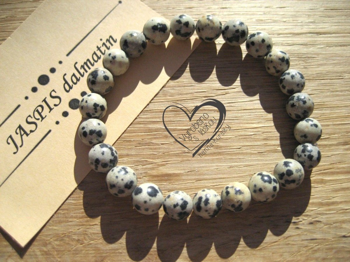 Náramek z minerálu Jaspis dalmatin, velikost korálků 8mm, obvod cca 18-18,5cm, kuličky jsou navlečeny na elastické gumičce - lycře, foto je ilustrační, protože každý náramek je originál, tudíž se může nepatrně lišit odstínem barvy či velikosti minerálních kuliček.
