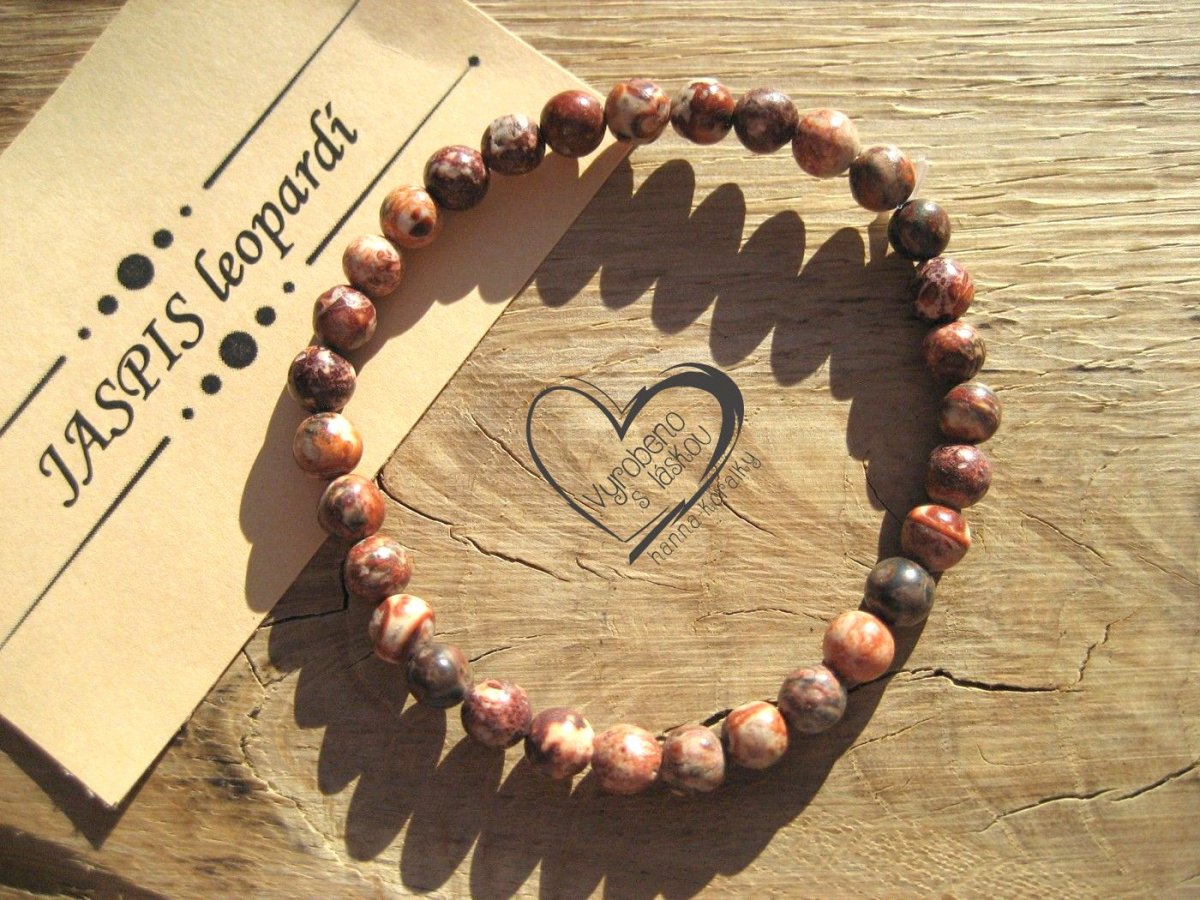 Náramek z minerálu Jaspis leopardí, velikost korálků 6mm, obvod cca 18-18,5cm, kuličky jsou navlečeny na elastické gumičce - lycře, foto je ilustrační, protože každý náramek je originál, tudíž se může nepatrně lišit odstínem barvy či velikosti minerálních kuliček.