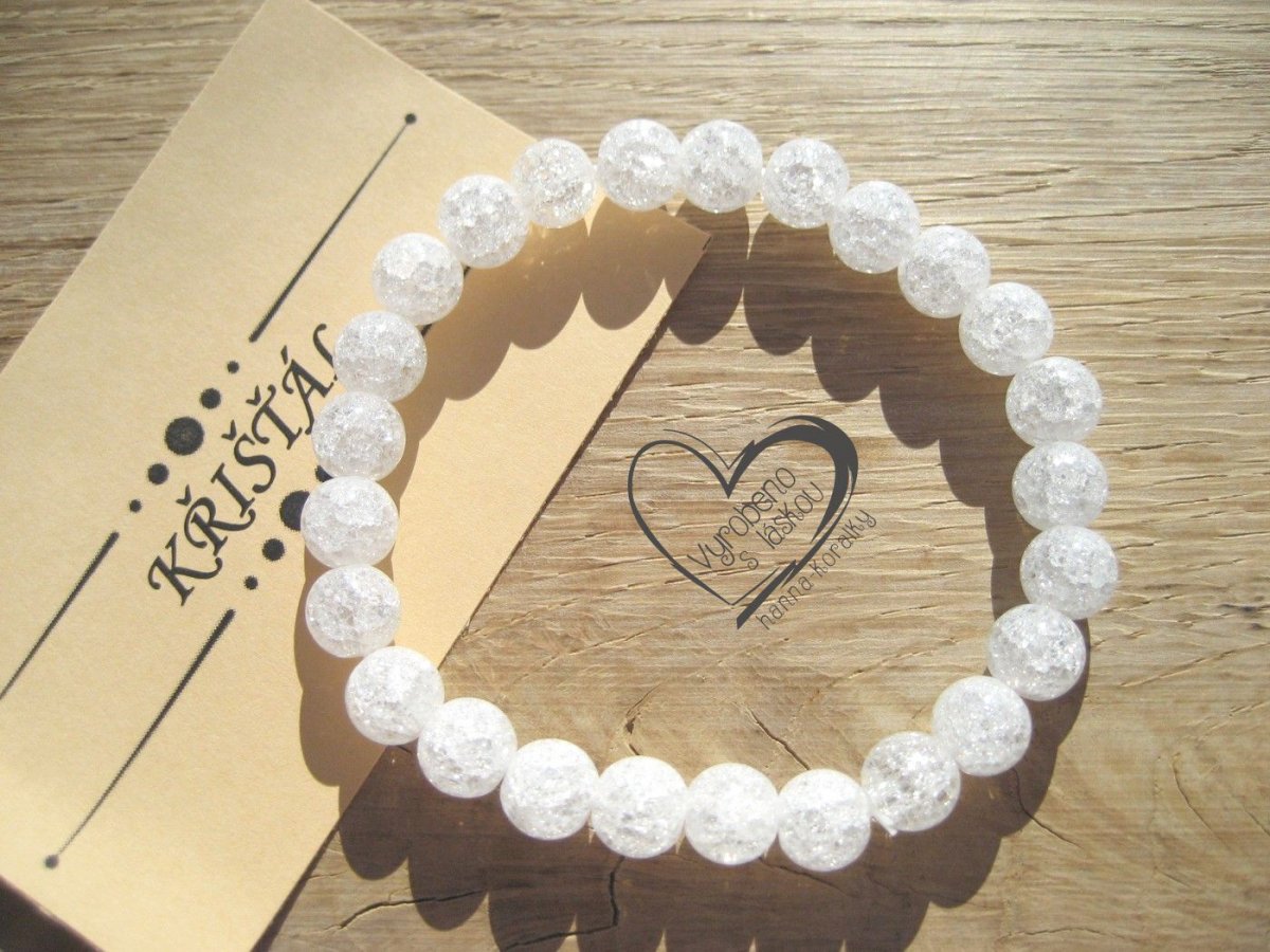 Náramek z minerálu Křišťál, velikost korálků 8mm, obvod cca 18-18,5cm, kuličky jsou navlečeny na elastické gumičce - lycře, foto je ilustrační, protože každý náramek je originál, tudíž se může nepatrně lišit odstínem barvy či velikosti minerálních kuliček.