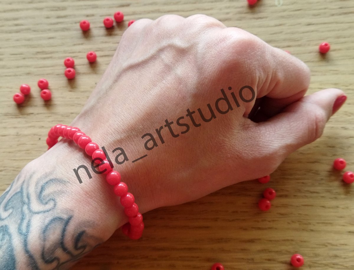 Náramek z korálků ve tvaru kuličky.Akrylové korálky ve tvaru kuličky 5 x 6 mm + elastická lycra 0,8 mm (pružný návlekový materiál), průvlak cca 1,8 mm.Rozměry náramku: cca 17 cm (33 korálků). Zabaleno v celofánovém sáčku.