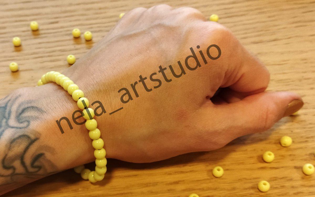Náramek z korálků ve tvaru kuličky.Akrylové korálky ve tvaru kuličky 5 x 6 mm + elastická lycra 0,8 mm (pružný návlekový materiál), průvlak cca 1,8 mm.Rozměry náramku: cca 17 cm (33 korálků). Zabaleno v celofánovém sáčku.