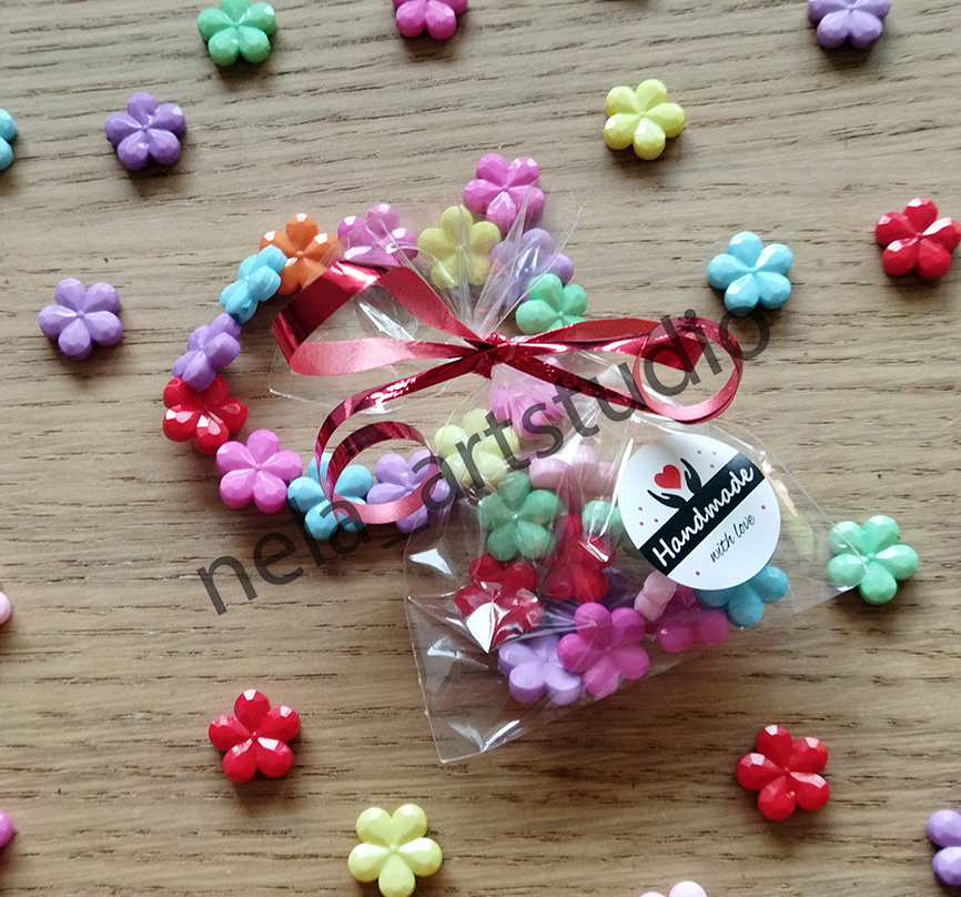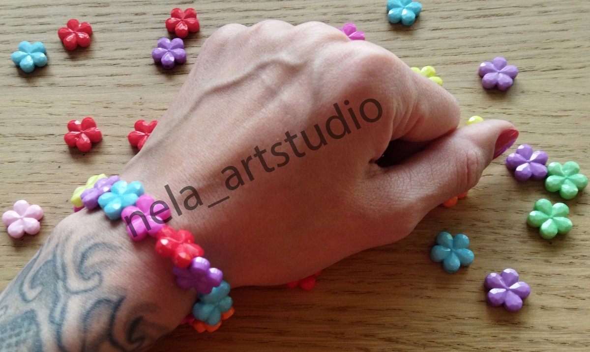 Náramek z korálků ve tvaru květiny.Akrylové, fasetované korálky ve tvaru květiny 14x13x4mm + elastická lycra 0,8mm (pružný návlekový materiál), průvlak cca 1,8mm.Rozměry náramku: cca 17,5cm (13 korálků). Zabaleno v celofánovém sáčku.