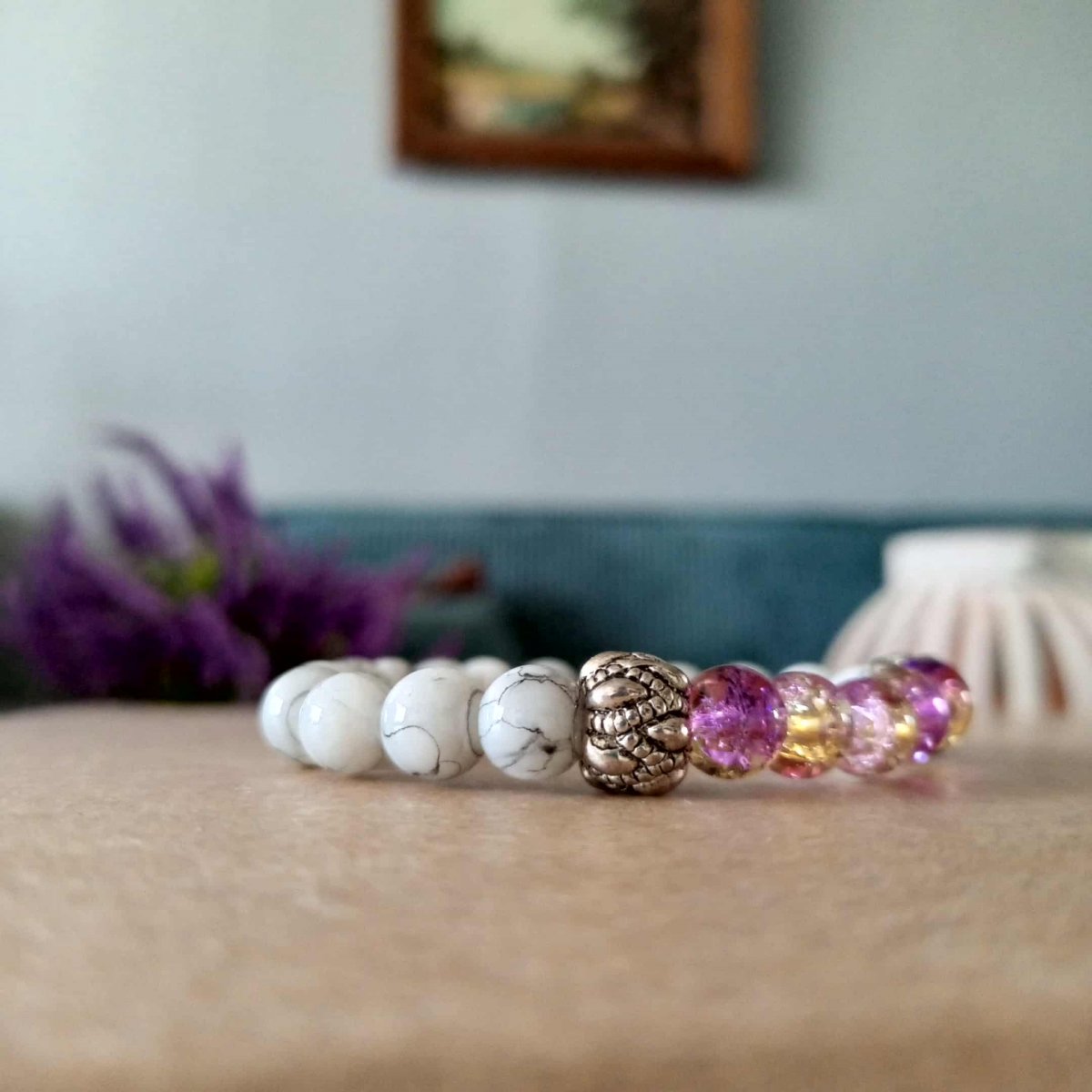 Náramek ze skleněných korálek 8mm , doplněný kovovými rondelkami.