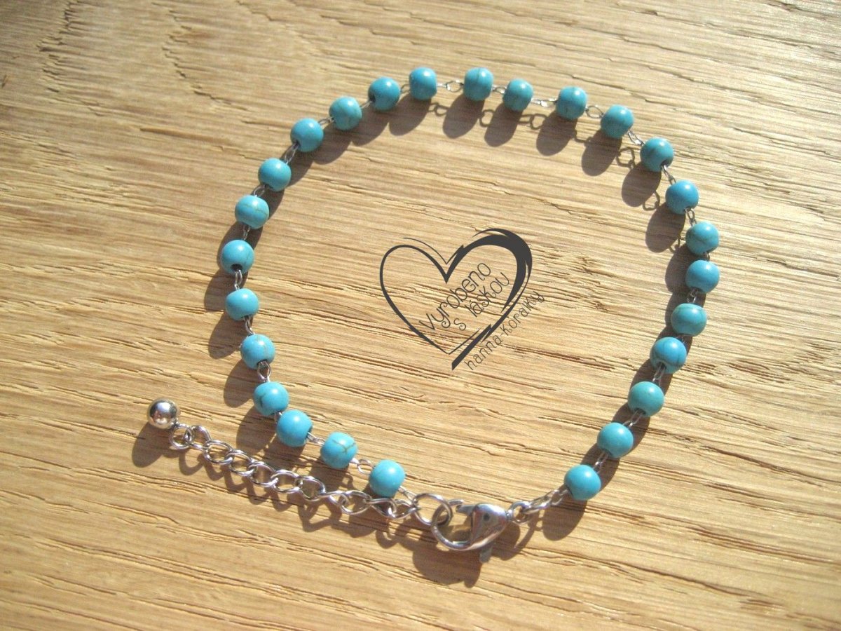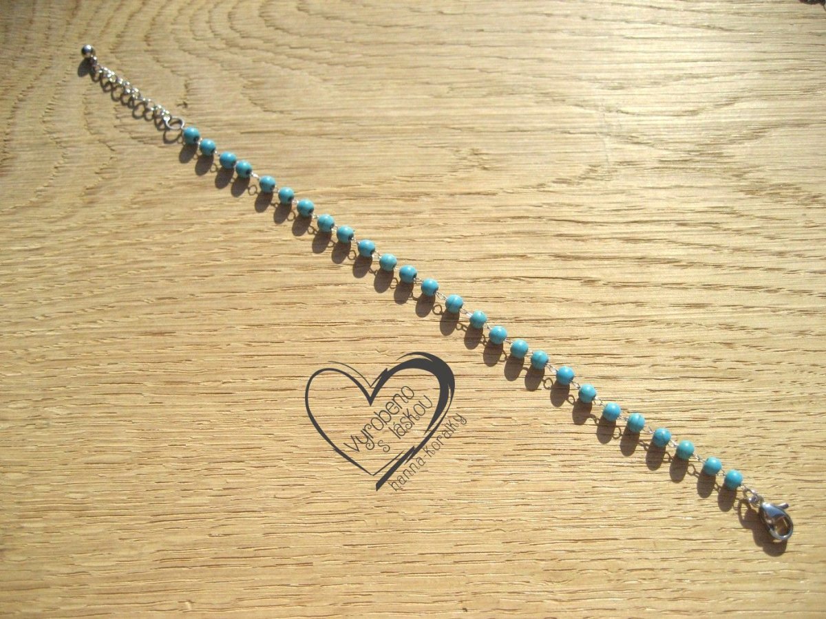 Jemný náramek z nerezové oceli s minerálem tyrkenit, šperk pro každou příležitost, velikost korálků 4mm a délka 19 + 3 cm prodlužovací řetízek zakončený ozdobnou kuličkou.