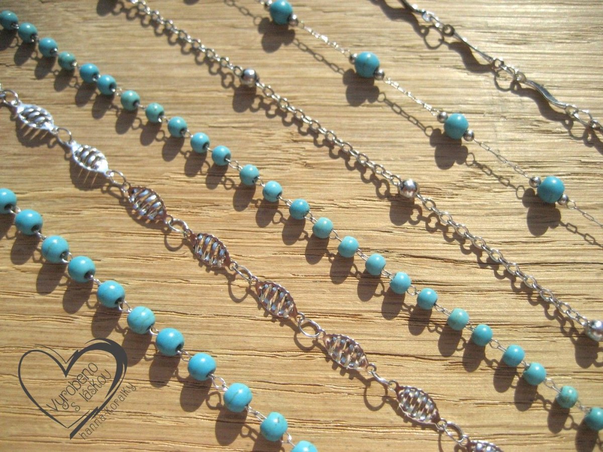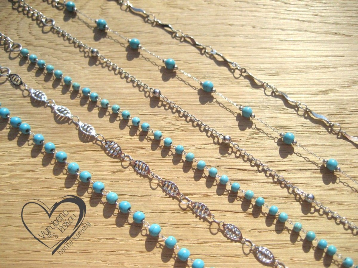 Jemný náramek z nerezové oceli s minerálem tyrkenit, šperk pro každou příležitost, velikost korálků 4mm a délka 19 + 3 cm prodlužovací řetízek zakončený ozdobnou kuličkou.